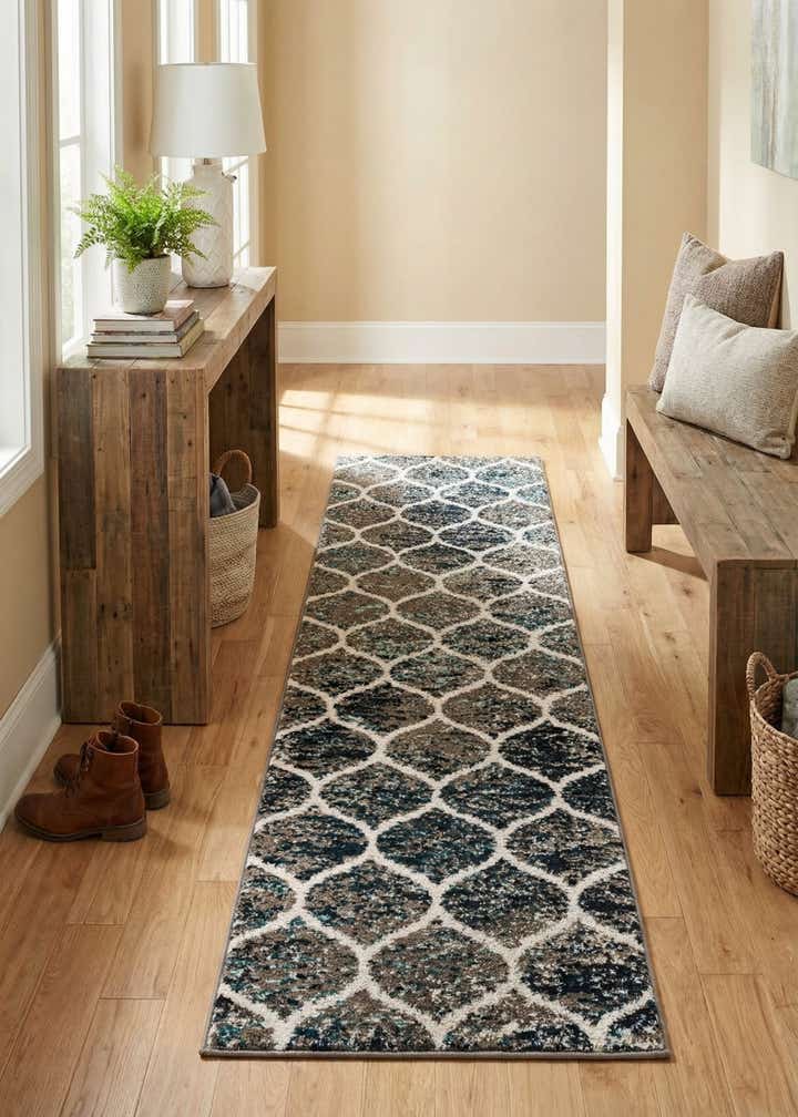 This runner works well in a variety of interiors—use it to define a hallway, line a kitchen galley, or add pattern beside a bed. It pairs naturally with light wood floors and ivory or navy furnishings for a coastal or transitional look, and also complements leather accents and warm metal finishes in more contemporary or modern farmhouse schemes.