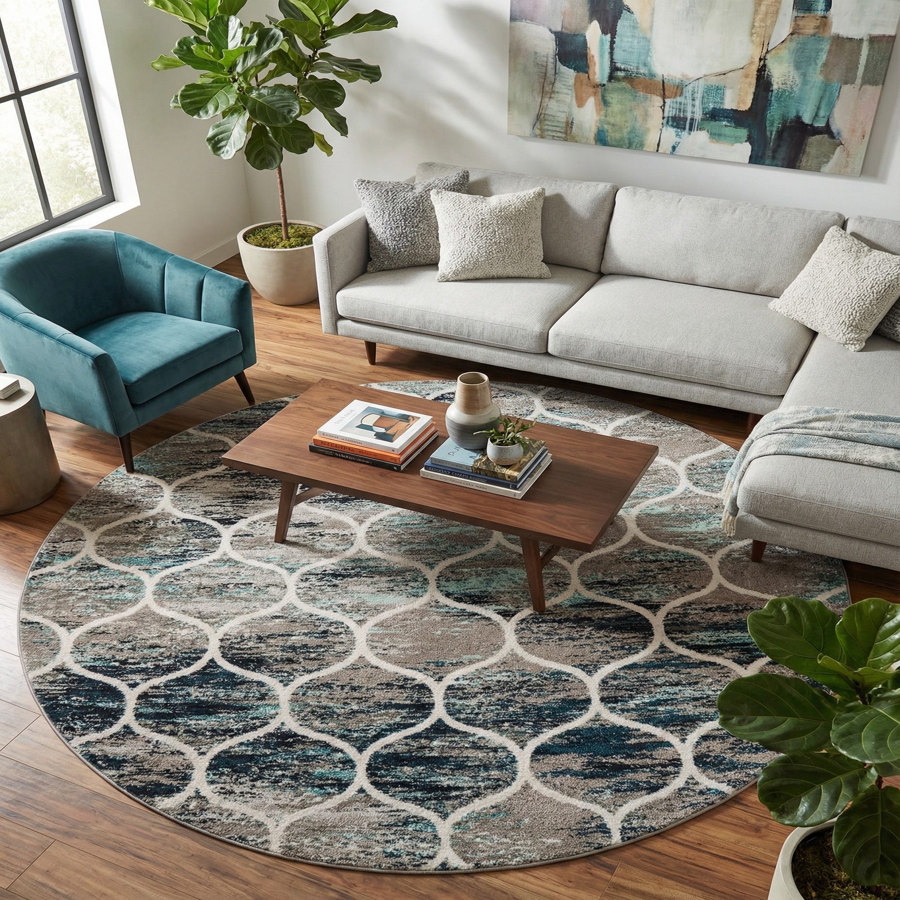 A classic ogee lattice is given a contemporary update in this round area rug. The Blue Multi background anchors the design while ivory outlines define the repeating trellis shapes. Inside each motif the surface shows a striated, slightly distressed effect with layered tones of blue, light blue, black, brown and light brown that add depth and visual texture. Machine made of 100% polypropylene, the rug has a low-profile pile with a soft, slightly cushioned hand that feels comfortable underfoot while keeping a neat, tailored appearance.