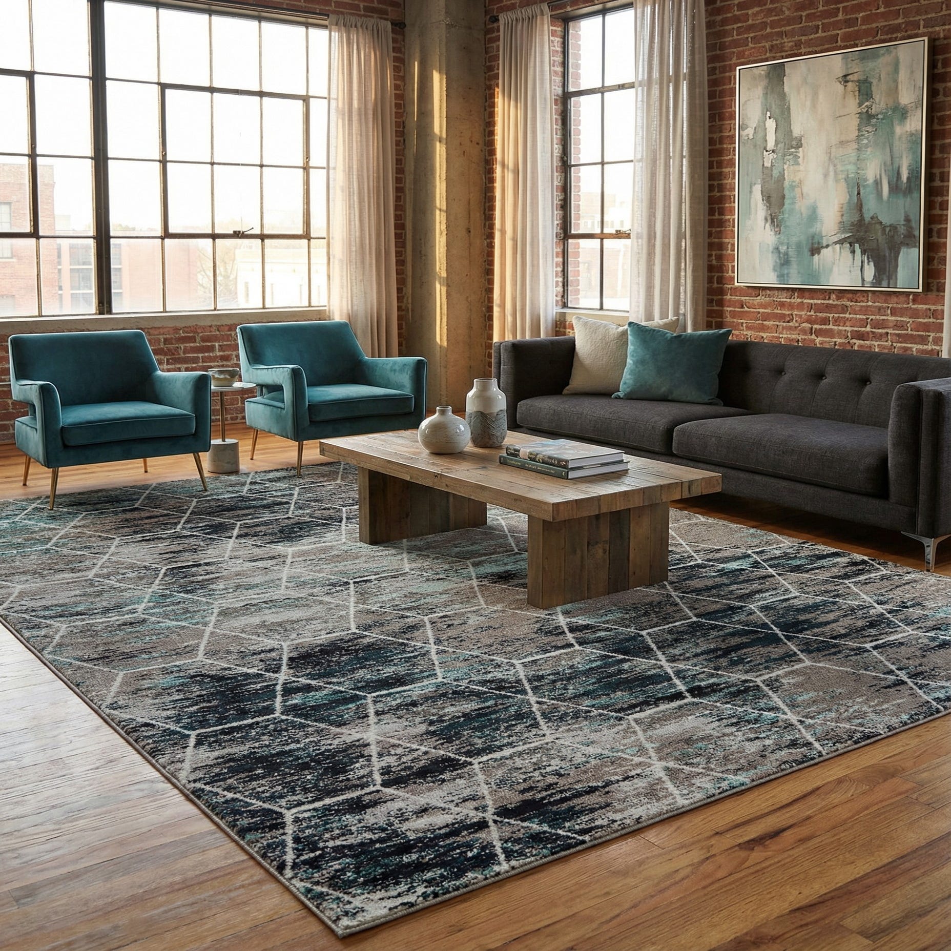 This rug complements contemporary, transitional, or coastal-inspired interiors; use it to anchor a living room seating area, define an open-plan dining space, or add color and texture to a home office or bedroom. Pair it with neutral upholstery and teal or navy accents for a coordinated palette, or layer warm wood furniture and metal finishes to emphasize the rug’s modern geometric character.