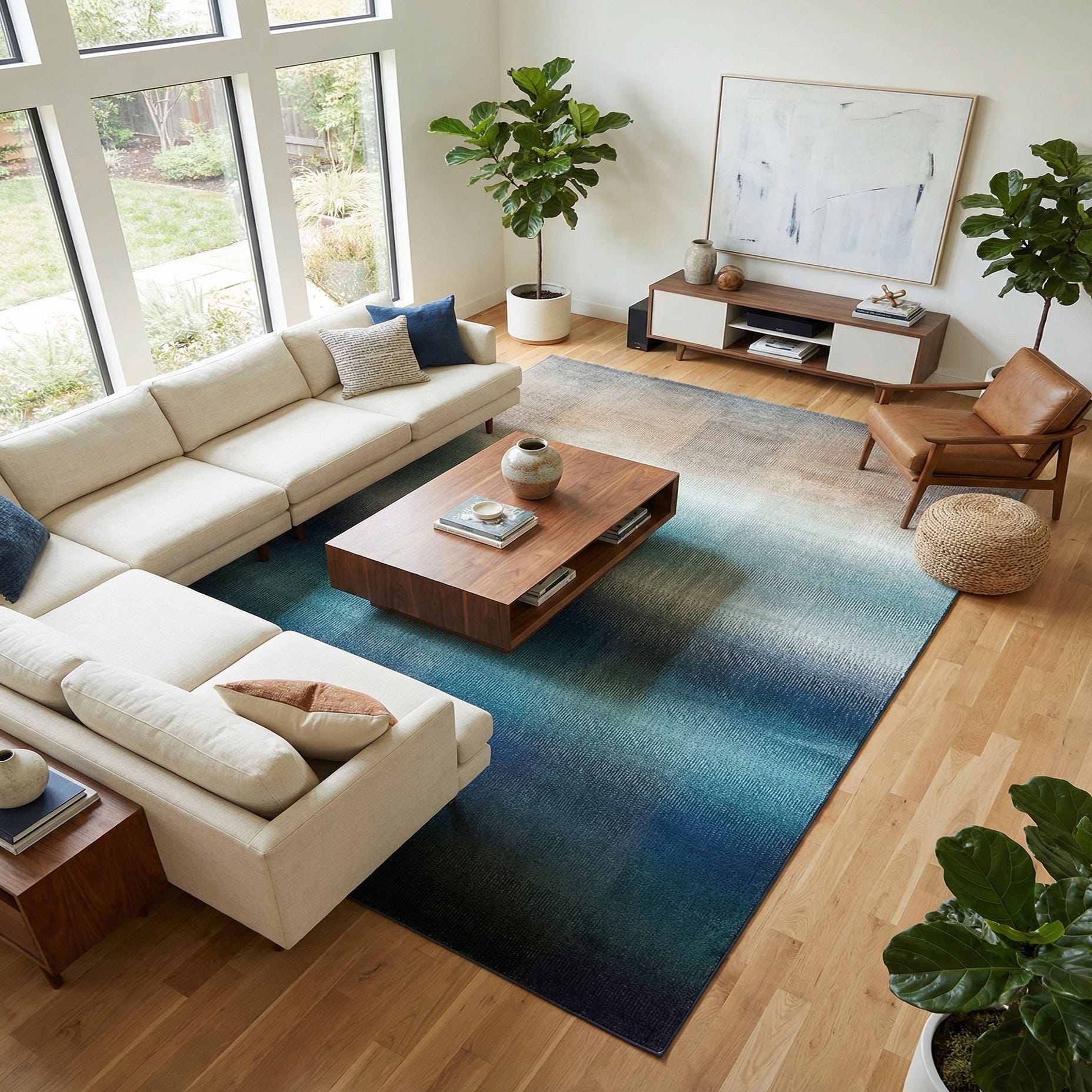 The rug’s balanced mix of blue, cream, gray, navy blue and peach makes it versatile for a variety of interiors. It anchors a coastal or transitional living room beautifully when placed beneath a coffee table and neutral sofa, and it brings calm color to a bedroom layered with light linens and warm wood tones. It also complements modern spaces—pair with mid-century furniture and brass or matte black accents for contrast—or use it in a home office to introduce color while maintaining a composed, professional look.