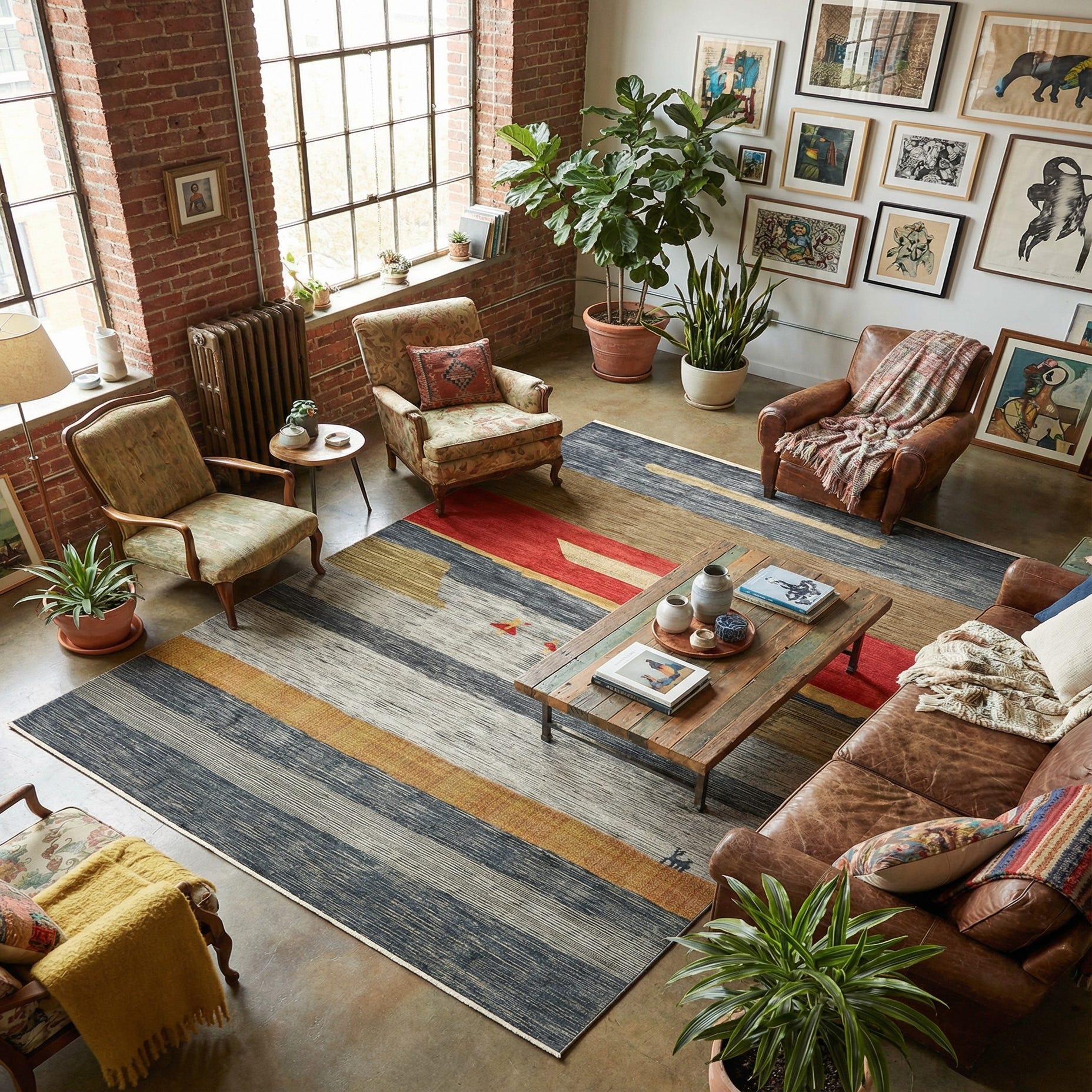 The rug works well as an anchor for a living area or under a sofa and coffee table where its horizontal lines can lengthen a room, and it pairs nicely with warm wood tones, minimalist modern furnishings, or mid-century silhouettes. Use it in a dining room or entry to make a graphic statement, or place it in a casual family or play space where the artistic motifs bring personality to the floorplane.