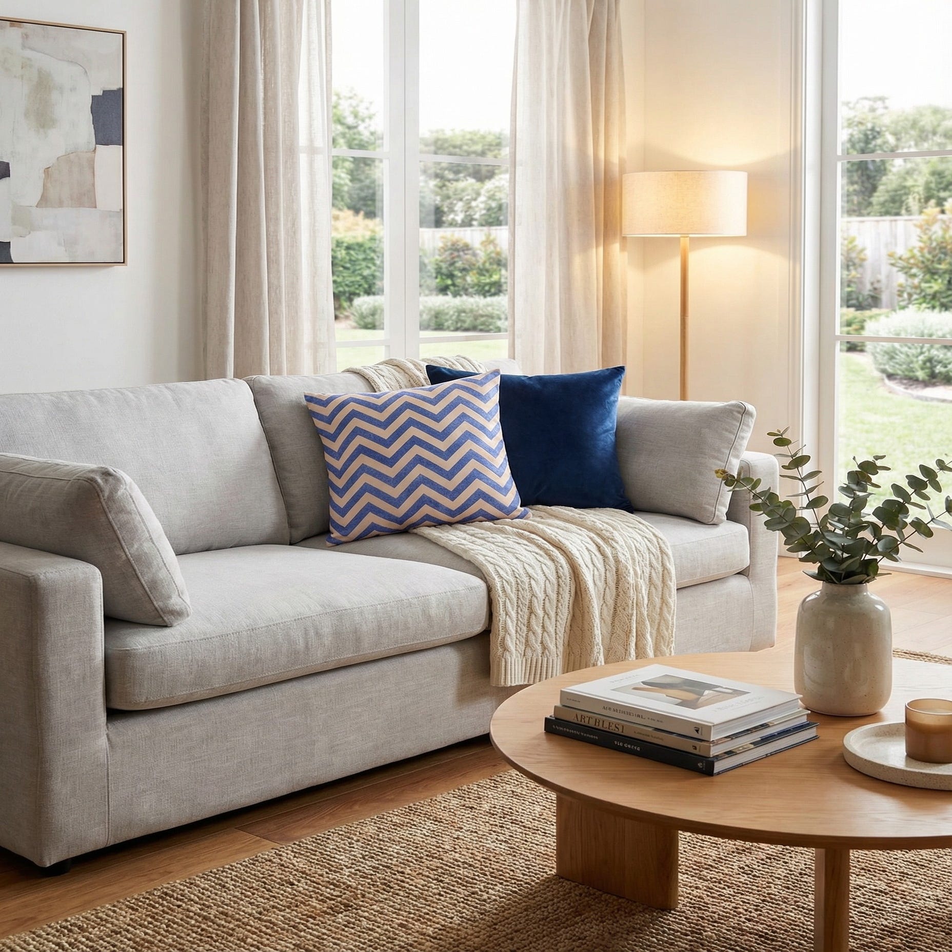 Primary color is Blue. Colors in this pillow include: Blue, Peach.
