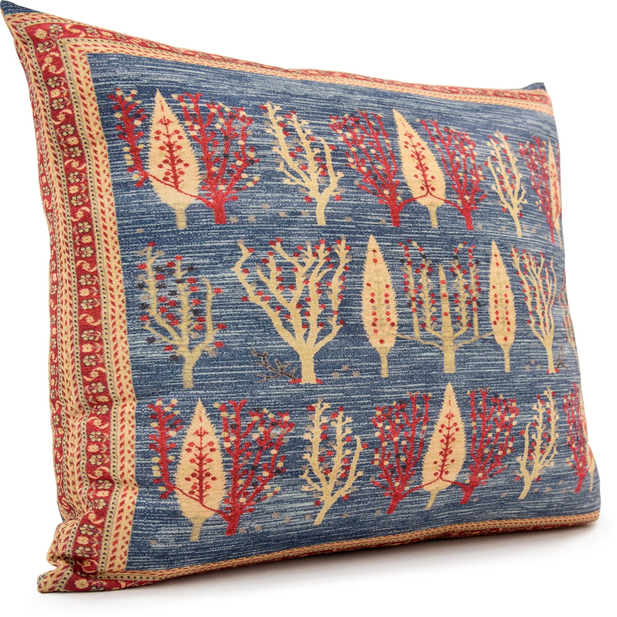 Primary color is Blue. Colors in this pillow include: Blue, Red, Gold, Tan, Brown, Light Blue.