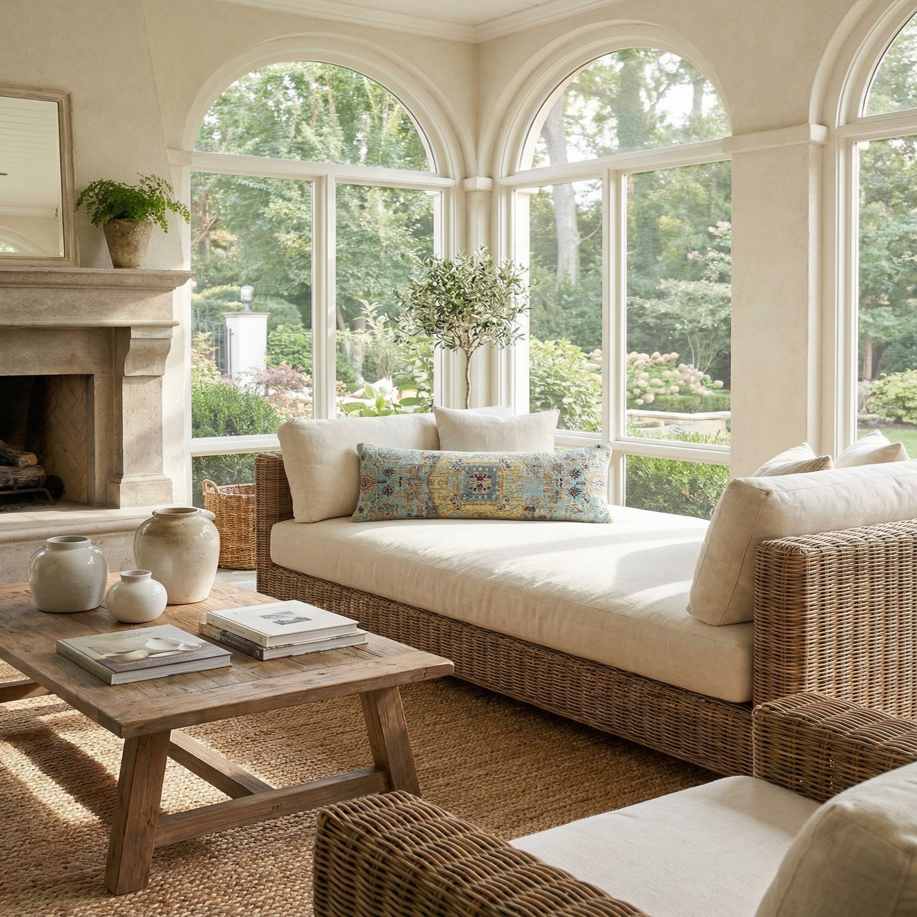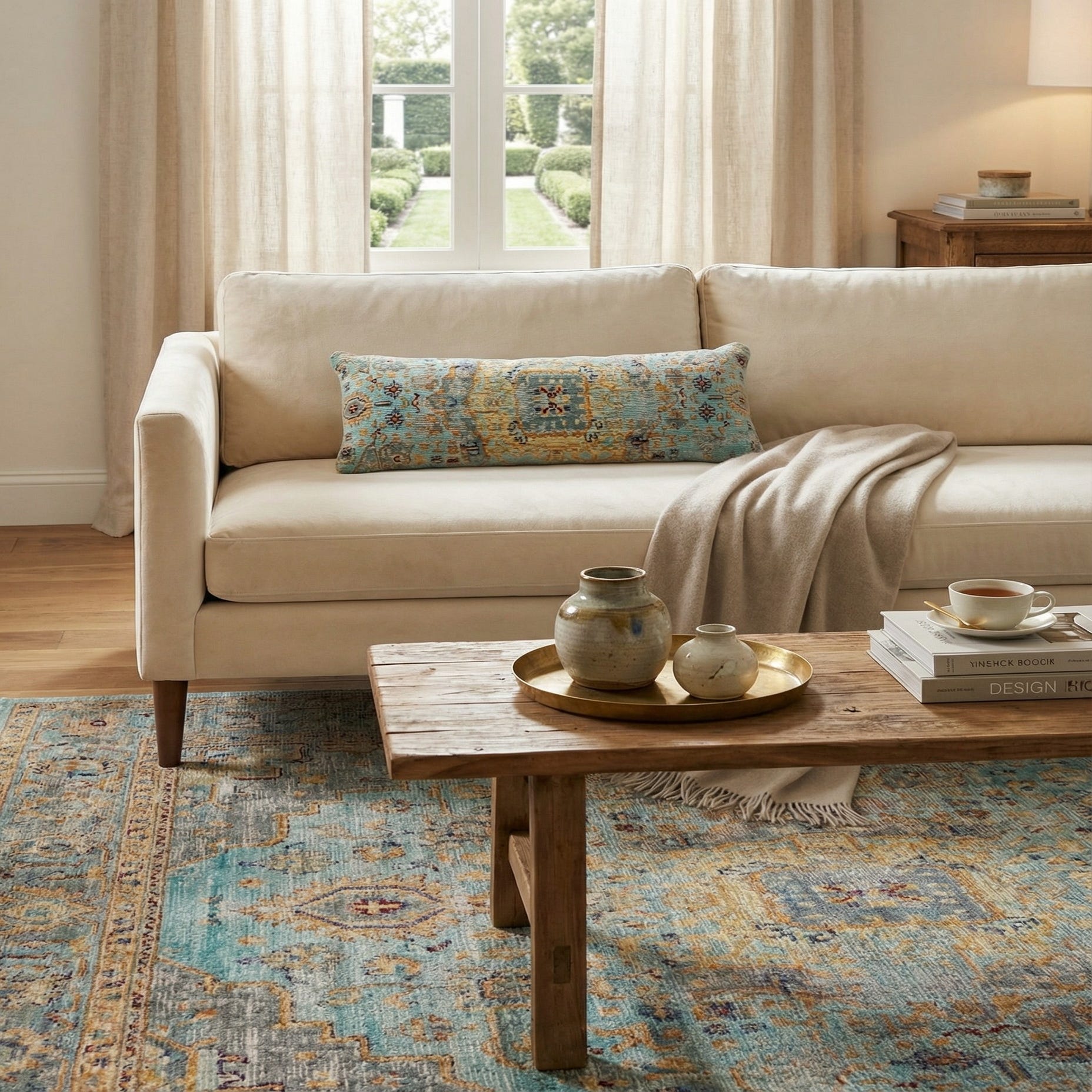 Primary color is Blue. Colors in this pillow include: Blue, Beige, Ivory, Orange, Purple, Red, Yellow, Green.