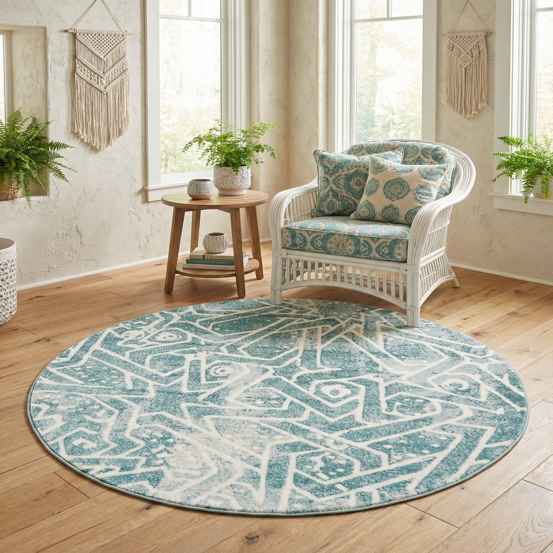 The blue-and-ivory palette works well in modern-meets-traditional schemes and coastal-inspired rooms alike. Use it to anchor a round dining table, define a conversational seating group in the living room, or add color and pattern to a sunroom or bedroom seating area. Pair with light woods, linen or gray upholstery, and metal accents—brass or matte black—to create a balanced, layered look.