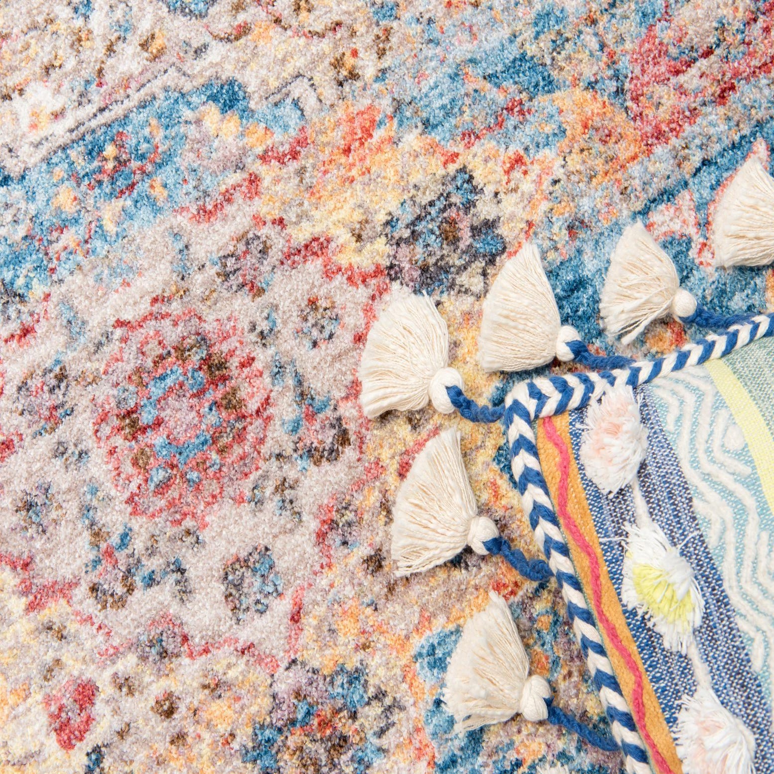 Primary color is Blue. Colors in this rug include: Blue, Beige, Brown, Orange, Red, Pink.