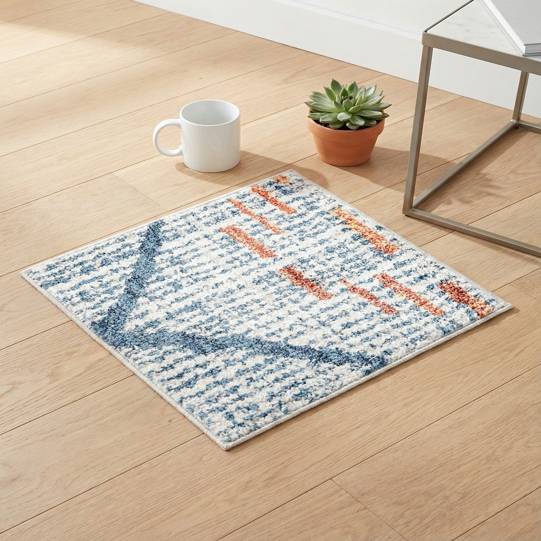 This piece is a sample, machine made of polypropylene, and its dense, slightly cushioned pile invites bare feet while holding up to everyday room use. It works well in a coastal-inspired living room or a bright, modern bedroom where the light blues and ivory keep the palette airy and the terracotta brings in an accent tone. Pair it with warm wood furniture and simple, clean-lined upholstery for a contemporary look, or layer it under a glass-top dining table to add color without competing with existing patterns.