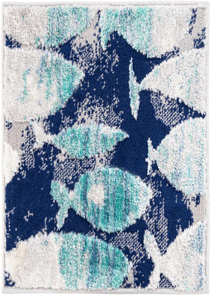 A bold, painterly pattern of stylized fish and organic shapes plays across a deep blue background, with pools of ivory, soft gray, and sea-glass green defining each motif. The design balances graphic contrast with a hand-painted look: edges carry a slight blur and freckled texture that give the pattern movement without looking busy. Underfoot the dense pile feels softly cushioned; the polypropylene and polyester blend produces a comfortable, resilient surface with a gentle sheen and visible yarn texture that invites touch.