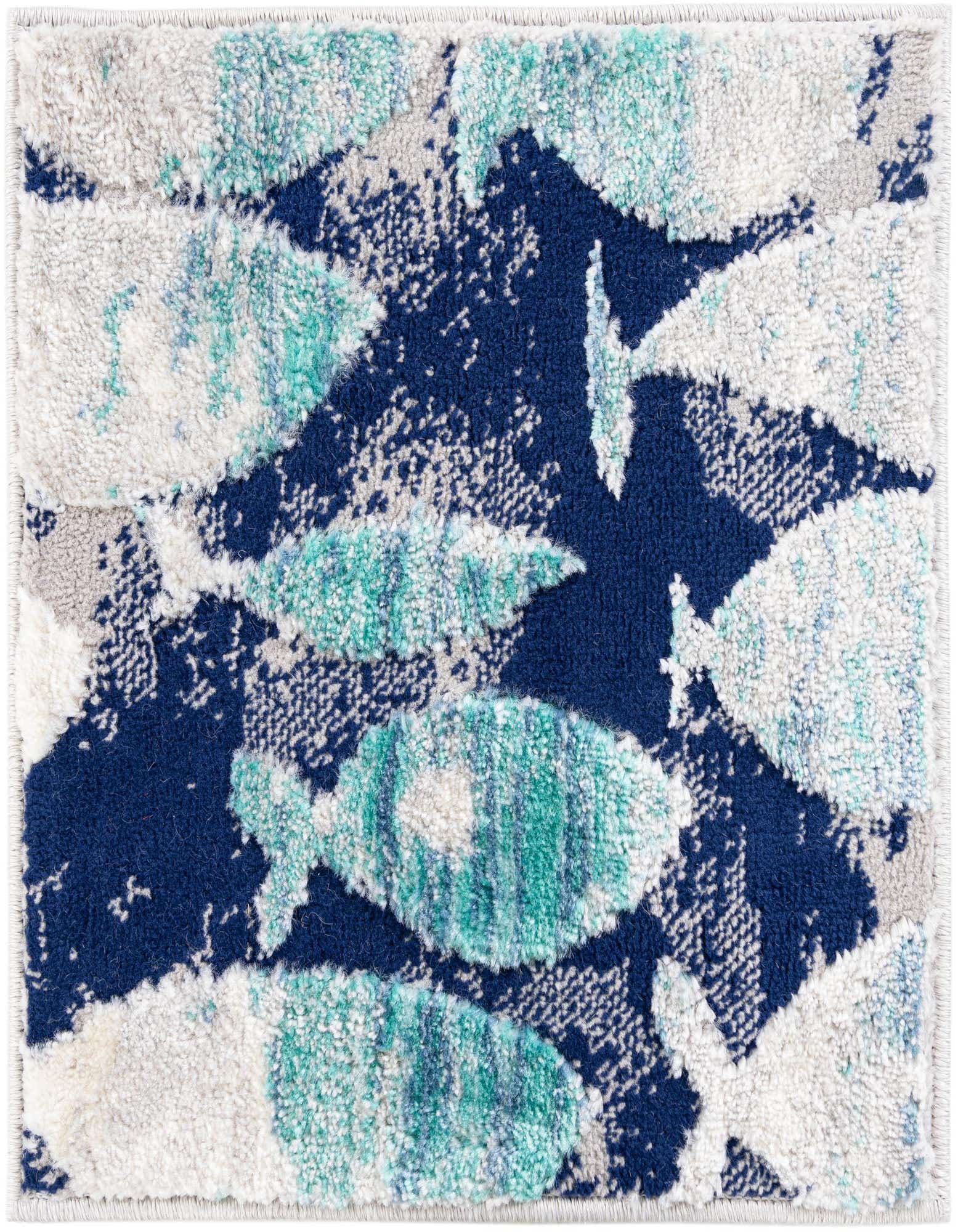 Ariel 1' 4 x 1' 4 Sample rug featuring a playful blue, teal, and white fish pattern on a dark blue background.