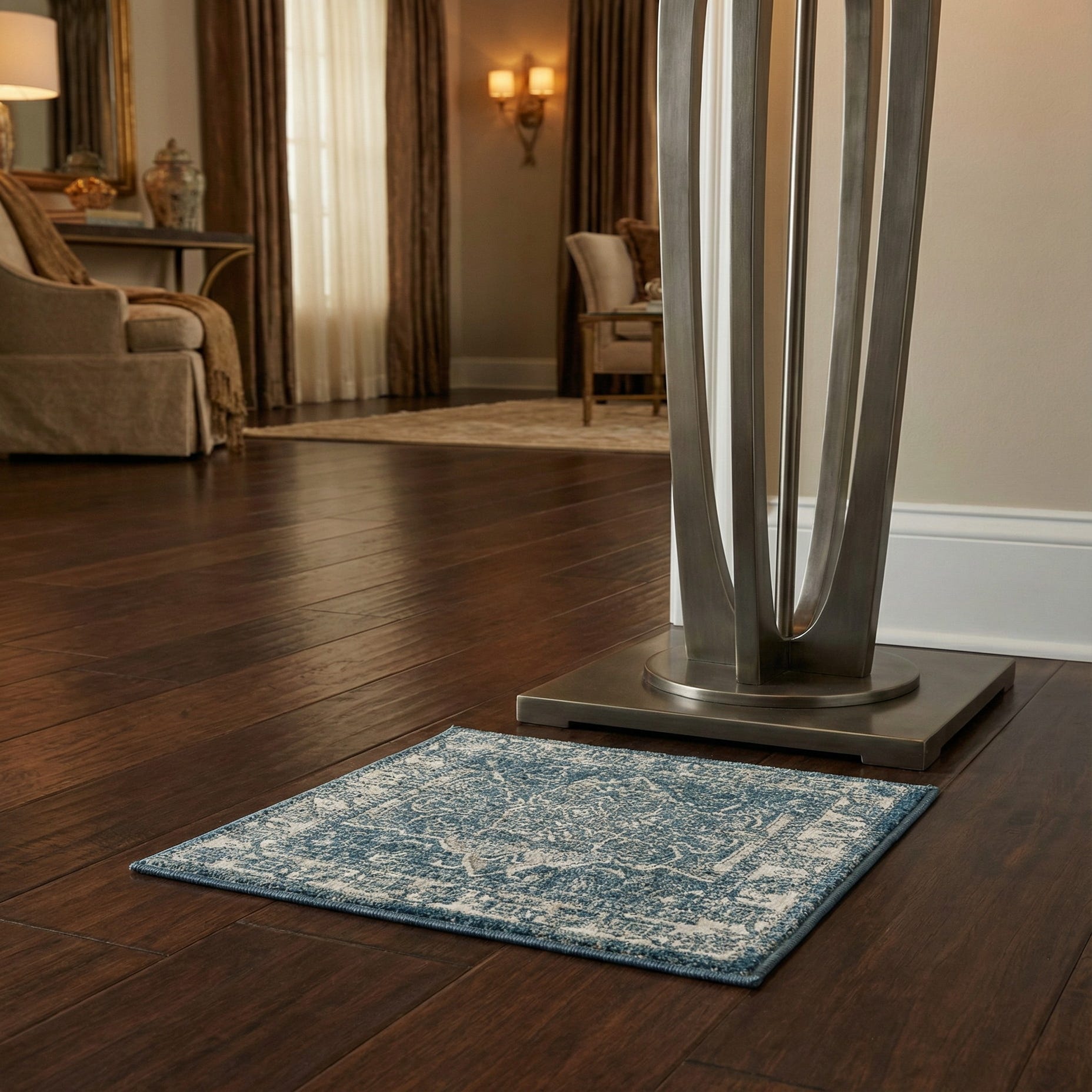 Machine-made from polypropylene and polyester, the rug has a low, even pile that feels soft yet structured underfoot, with subtle surface variation where lighter fibers emphasize the pattern against the blue background. This sample works well under a coffee table in a living room, layered at the foot of a bed, or as an anchor in a home office. It pairs particularly well with light wood floors, navy or ivory upholstery, and woven or leather accents for transitional, coastal, or contemporary-traditional interiors. This piece is a Sample.