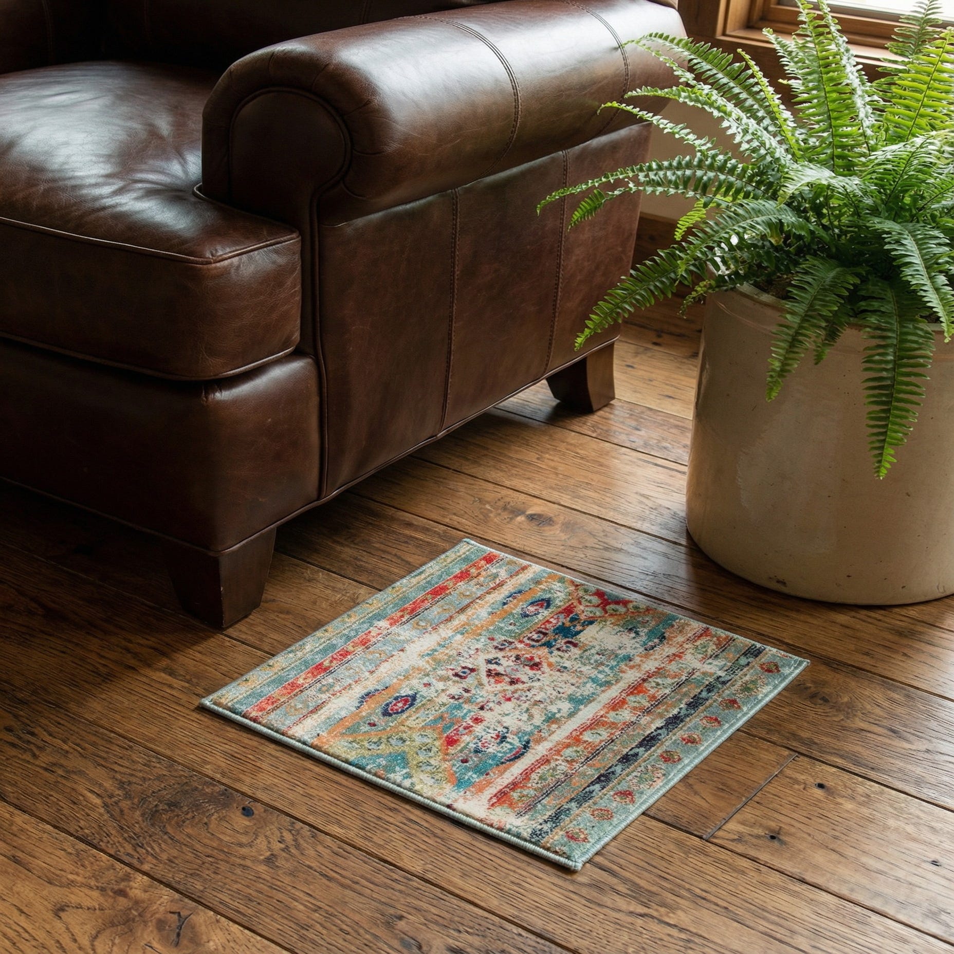 This piece is a Sample and is machine made of 100% polypropylene. The construction yields a low-profile, even pile that feels smooth underfoot with a softly brushed texture that highlights the faded colorwork. Place it as a runner in an entry or hallway, layer it at the foot of a bed, or let it anchor a casual living area—pairs especially well with neutral upholstery, warm wood tones, and eclectic or mid-century furnishings to balance color and pattern.