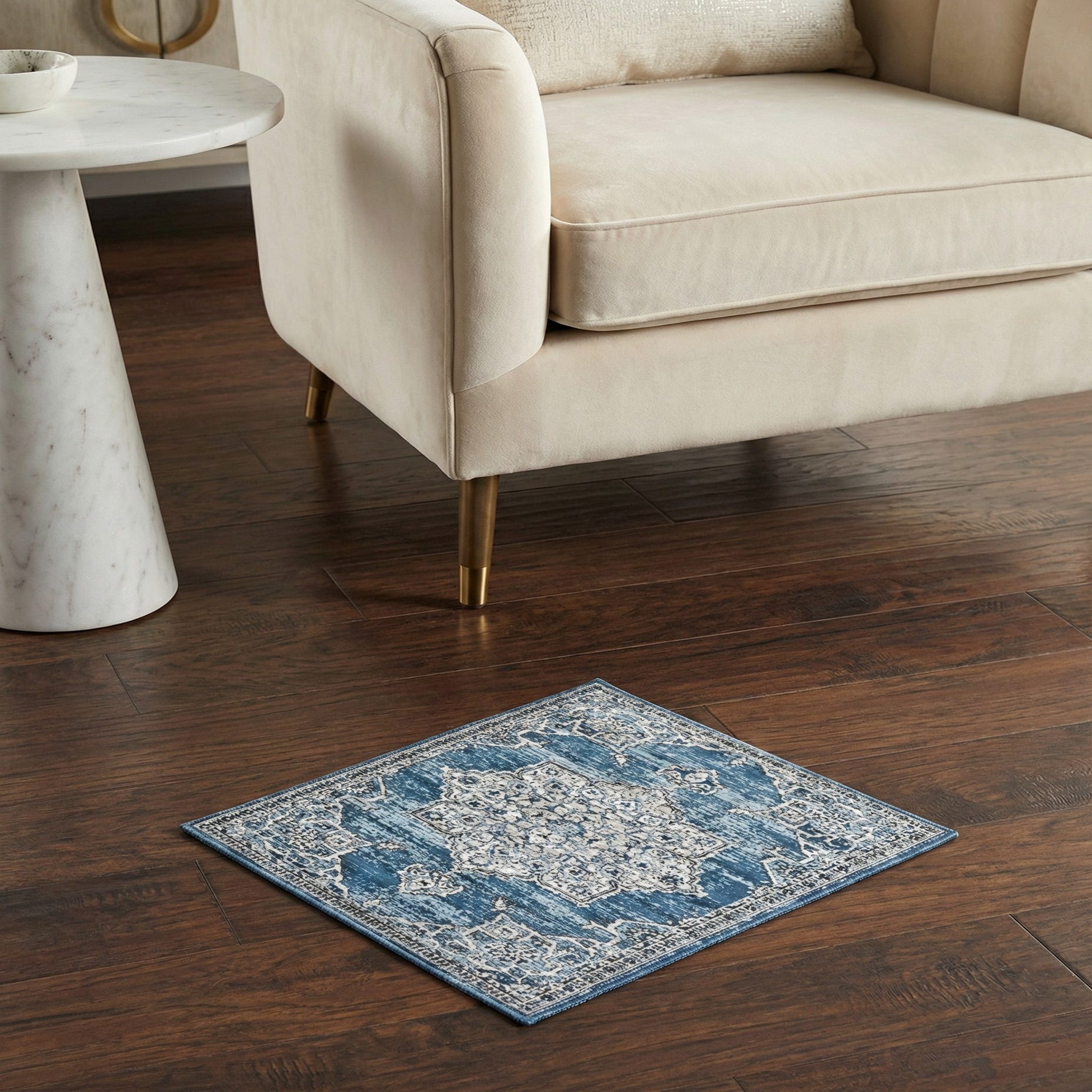 Machine made of 100% polypropylene, this sample has a low-profile pile that feels smooth underfoot with a subtle cushion. The synthetic weave holds the pattern definition crisply while the blue field lets the ivory and gray highlights stand out. Ideal for a living room beneath a coffee table, a transitional bedroom, a coastal or modern-traditional entryway, or layered in a casual dining area to introduce color and pattern. This piece is a sample.