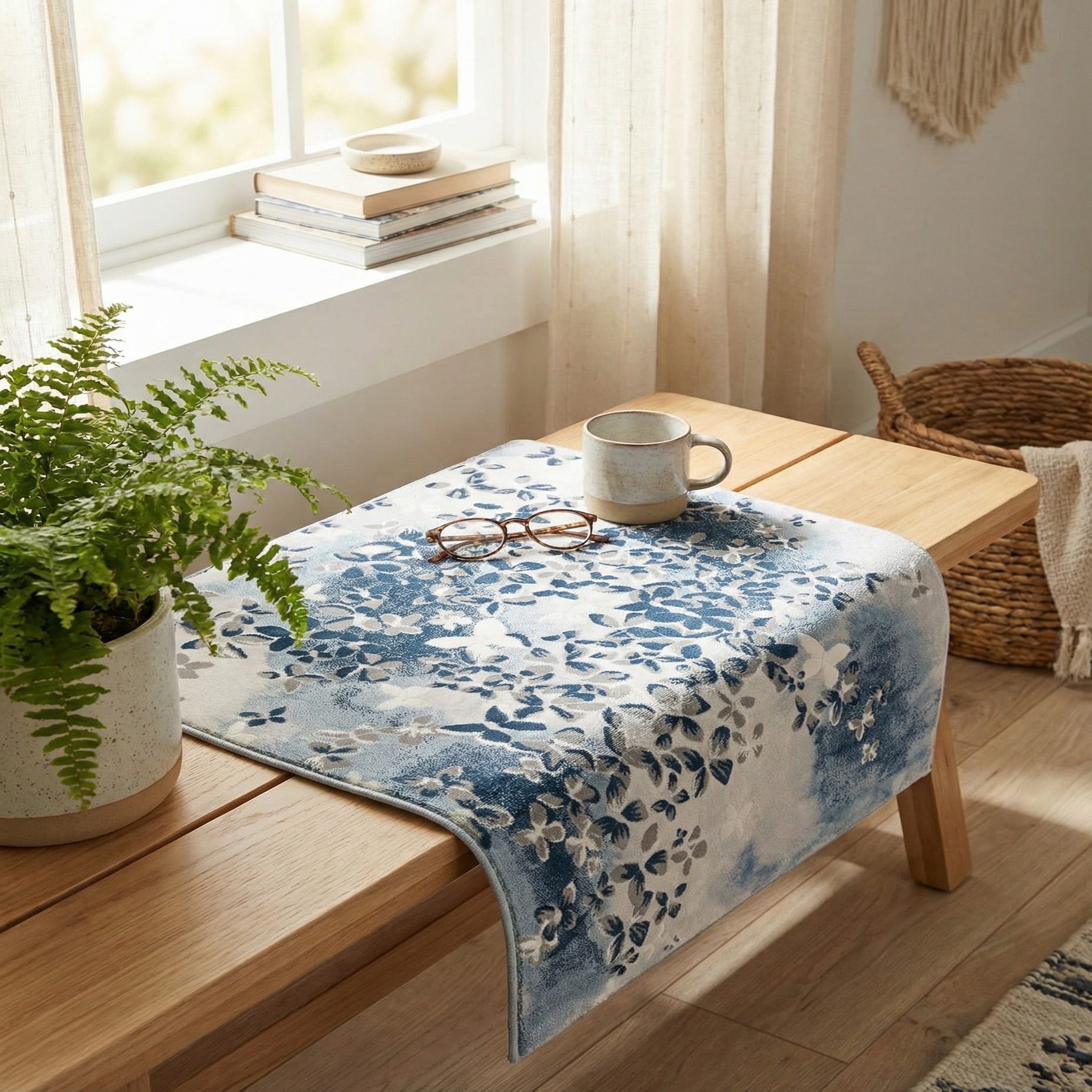 A soft blue background sets a calm base for this contemporary floral rug. Watercolor-like washes of navy and ivory create a layered, painterly field, while clusters of small leaves and butterfly shapes in navy, gray and ivory form a scattered, organic pattern. A cut-and-loop construction gives the motifs a slightly raised texture against a smoother ground, so you can feel gentle dimension underfoot while the overall pile stays low-profile and soft.