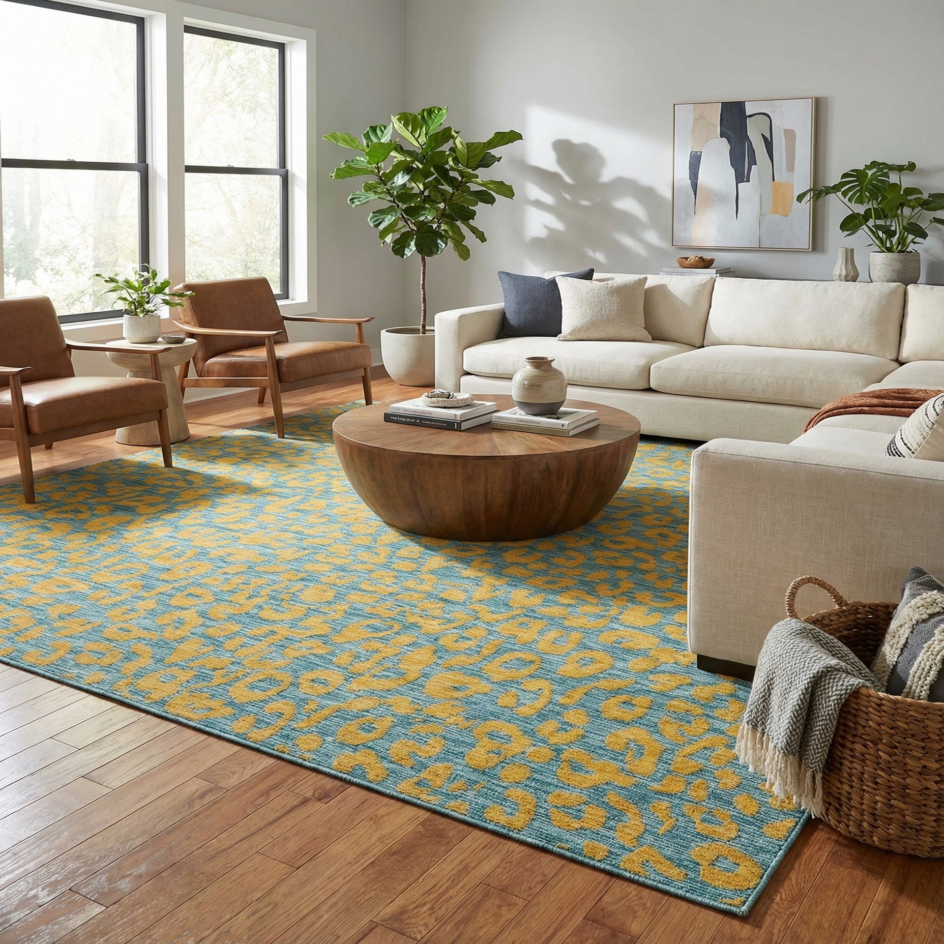 A lively leopard-inspired pattern in warm golden yellow sits atop a blue-yellow ground, the two tones working together to create a fresh, modern take on an animal motif. The background shows subtle linear striations in blue that add depth and movement, while the irregular spot shapes are bold but relaxed. Machine-made of 100% polypropylene, the rug has a low-profile, tightly woven surface with a slightly ribbed hand that feels steady underfoot and layers easily in high-traffic areas.
