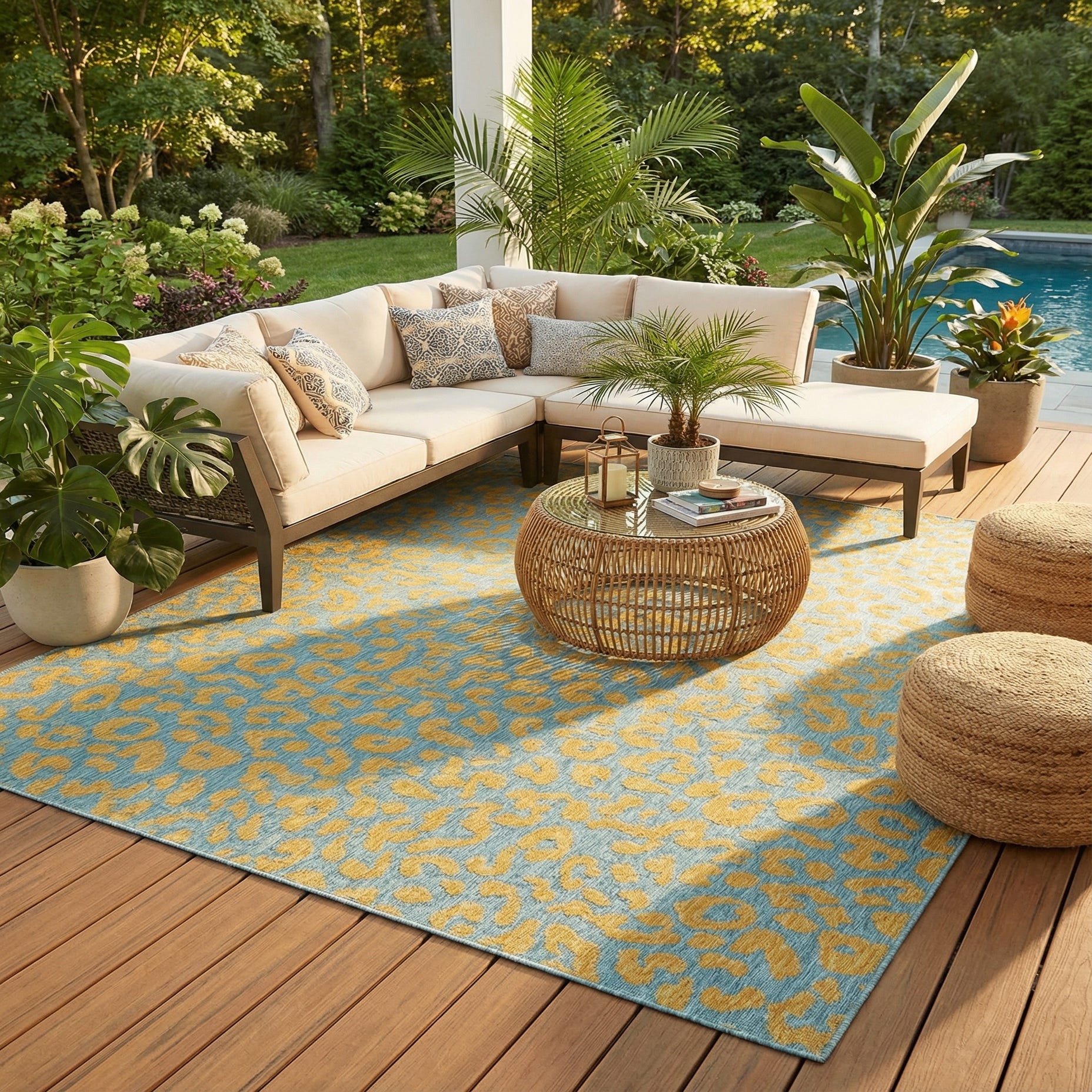A 13' square blue and yellow modern area rug with an abstract leopard print pattern, suitable for indoor or outdoor use.