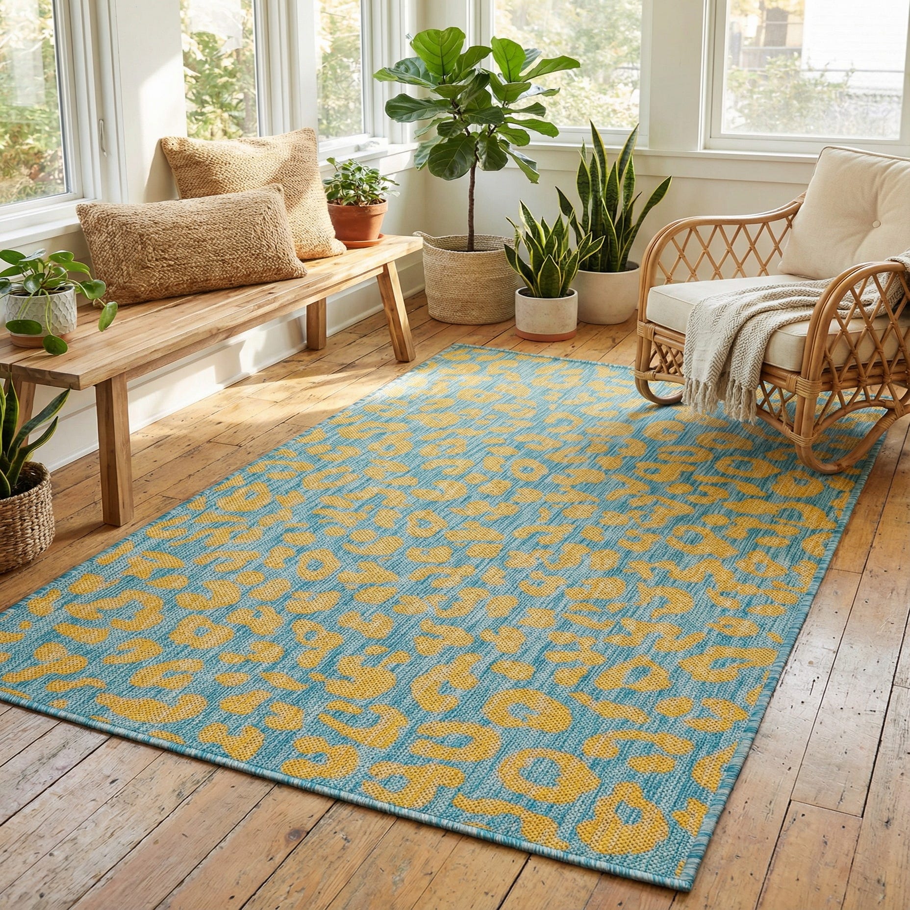 A playful animal-print pattern in sunny yellow pops across a cool blue background, creating a lively yet approachable look. The design layers organic, irregular leopard spots over a subtly ribbed field, giving the surface visual depth and movement. Machine made from 100% polypropylene, the rug has a low-profile, flat-woven texture that feels firm underfoot with a faintly textured weave you can feel when you run your hand across it.