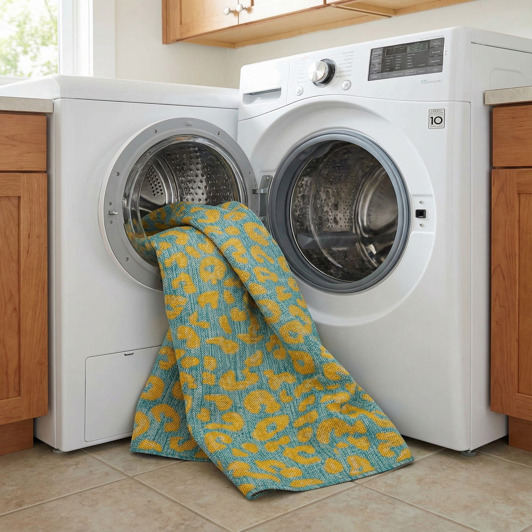 A playful, leopard-inspired pattern in warm yellow scatters across a cool blue field, with subtle vertical ribbing that adds visual depth to the flat surface. The print balances organic, irregular spots with a clean, modern repeat, giving the rug a lively yet controlled look. Run your hand over the surface and you’ll notice a low-profile, tightly woven texture—more of a structured mat than a plush pile—with a pleasant tactile weave underfoot.