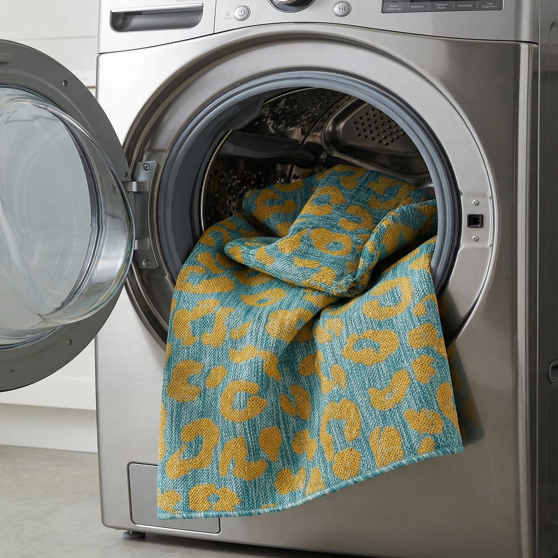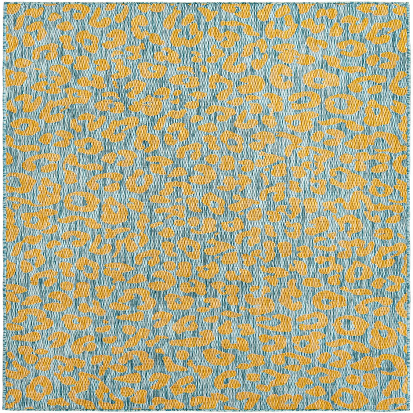 A playful leopard motif takes center stage on this outdoor rug, with warm yellow spots scattered across a blue-yellow ground. The background shows narrow, linear striations of blue that create a woven, textured look beneath the animal pattern, giving the surface visual depth without adding height. Run your hand over it and you feel a low-profile, tightly woven texture—flat to the touch with a slight ribbed quality where the pattern meets the ground.