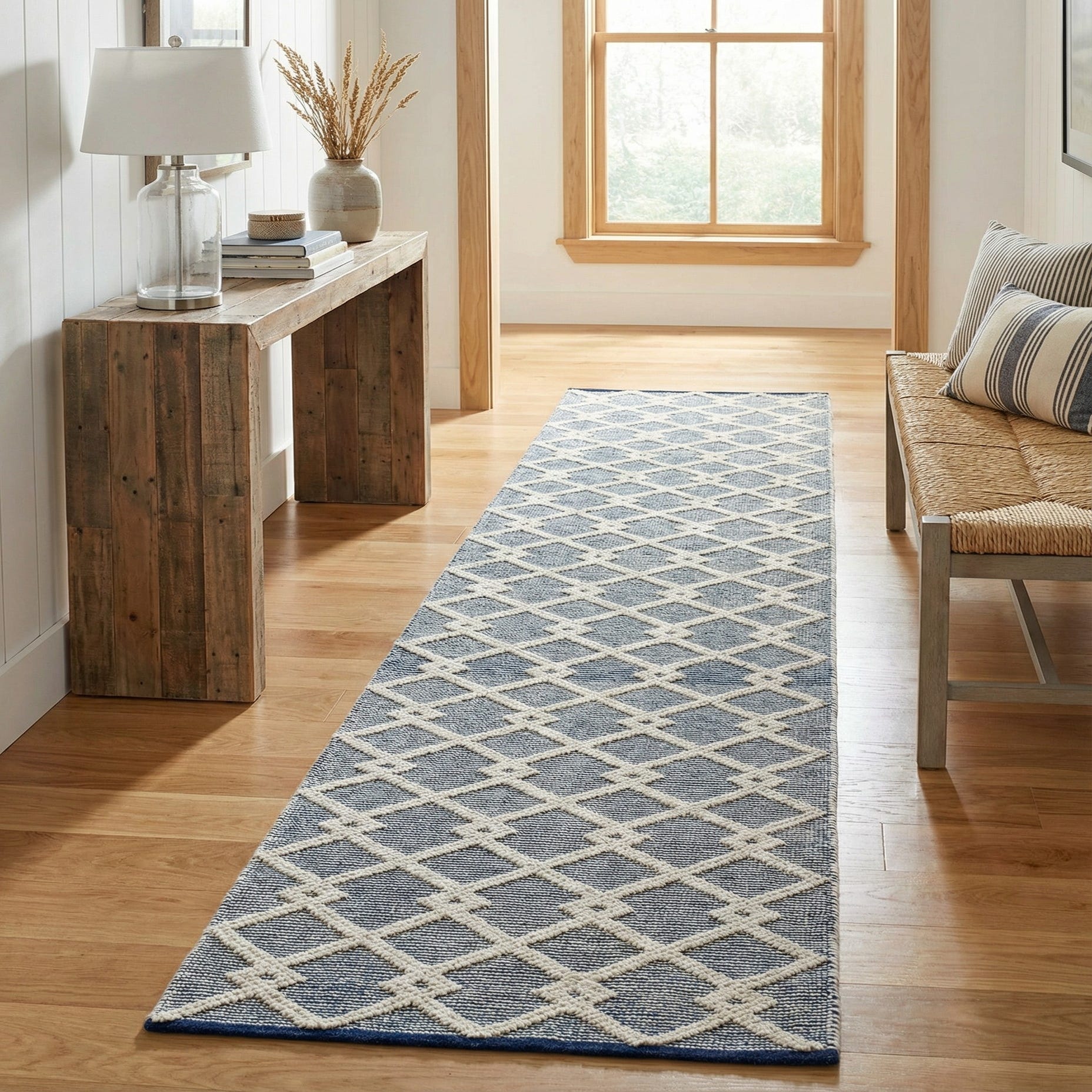 This runner works well in narrow circulation spaces — think entry halls, kitchen aisles, or layered down a staircase — and pairs cleanly with painted white trim, bleached or medium-toned wood floors, and coastal or transitional furnishings. Use it to anchor a pair of benches in a foyer, lead a visual line through an open-plan kitchen, or add pattern to a long gallery wall: its structured geometry complements relaxed linen upholstery as easily as streamlined modern pieces.