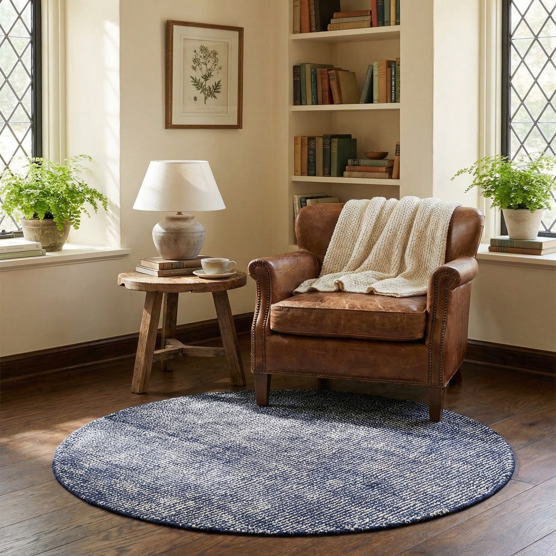 The Jill Zarin English Manor Collection offers a distinct 3 Ft Round hand-woven rug made of 100% wool, featuring a rich Blueberry background complemented by Ivory accents. Its texture presents a dense weave that provides a substantial feel underfoot, while the handcrafted nature ensures each piece is unique. The rug exhibits a modern, textural pattern with a slight heathering effect that can add depth and interest to a space.