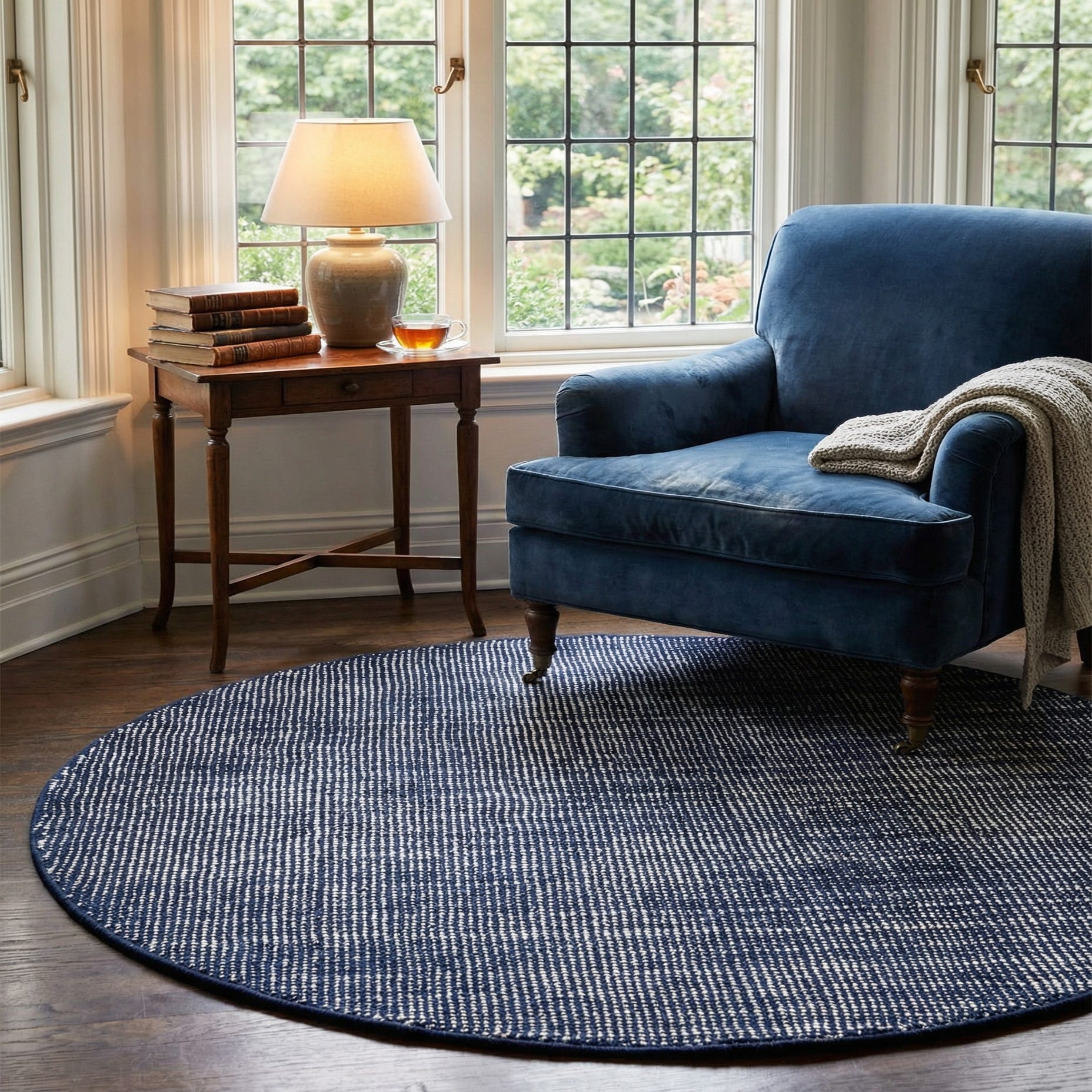 This piece works well in a range of interiors — place it under a round bistro or dining table to define the spot, tuck it beneath a reading chair to create a cozy nook, or layer it in a living room to anchor a seating arrangement. The deep blueberry ground pairs naturally with light linens and warm wood tones, while the ivory accents coordinate with metal finishes like brass or matte black for added contrast.