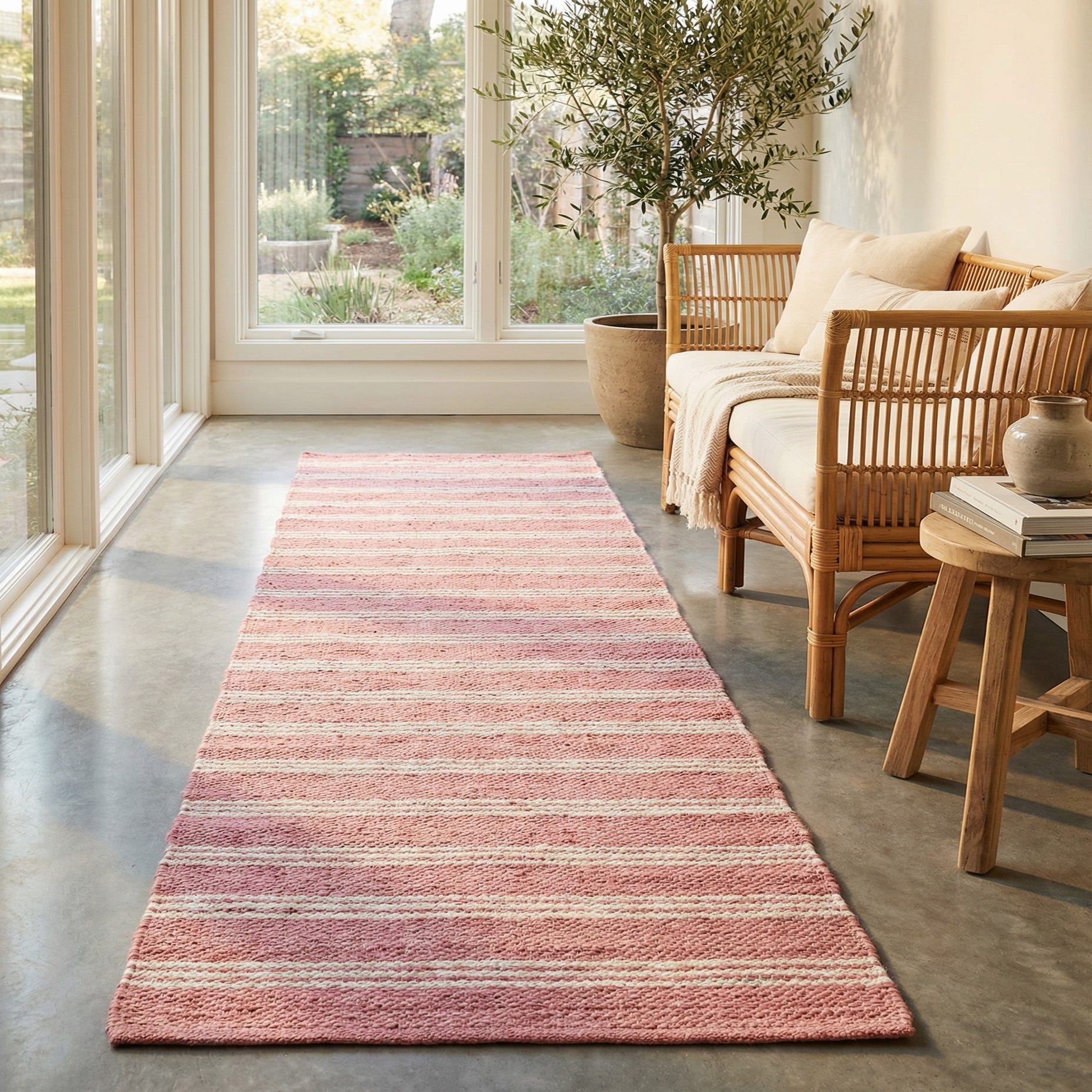 A soft blush pink field is interrupted by narrow ivory bands that run across the width, forming a clean, linear stripe pattern with a handcrafted feel. Hand woven of jute and wool, the flatweave construction pairs the natural slub and grain of jute with the gentle give of wool, creating a tactile surface with subtle ribbing where tighter and looser weaves alternate. Solid ivory end borders frame the runner, keeping the look crisp and balanced.