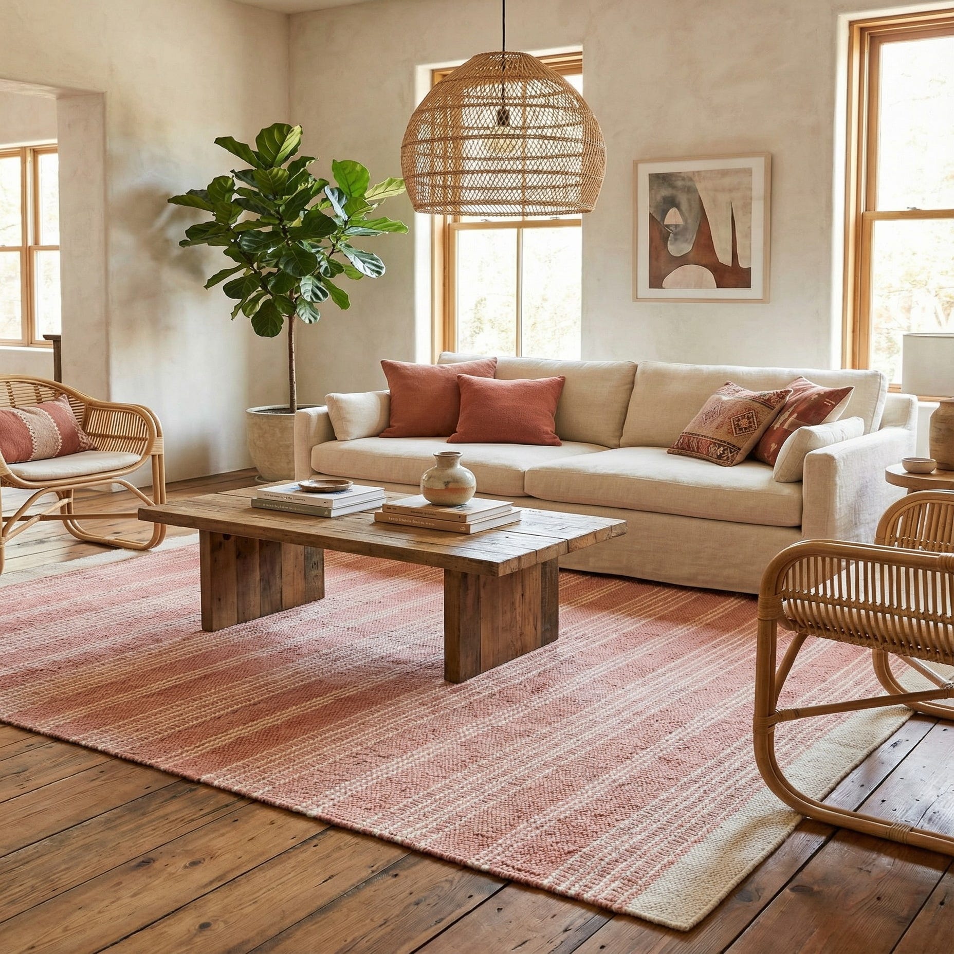 Soft, hand-woven stripes in blush pink and ivory create a calm, refined look. The pattern alternates broad fields of warm blush with narrow ivory bands, producing a subtle linear rhythm across the surface. Hand woven of jute and wool, the rug has a flat-woven profile with a slightly nubby, tactile feel from the jute and a gentle give from the wool—pleasant underfoot while retaining a clean, low-profile appearance. The top and bottom edges are finished in ivory for a neat frame.