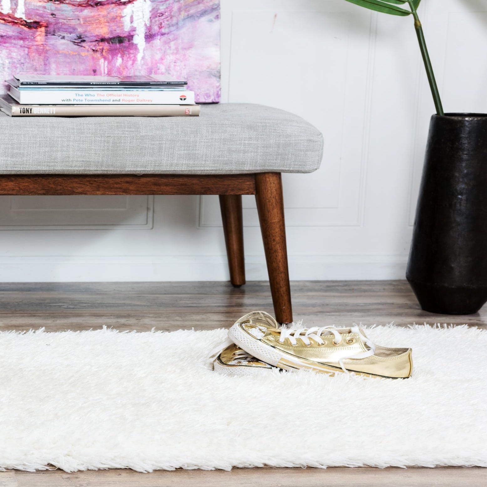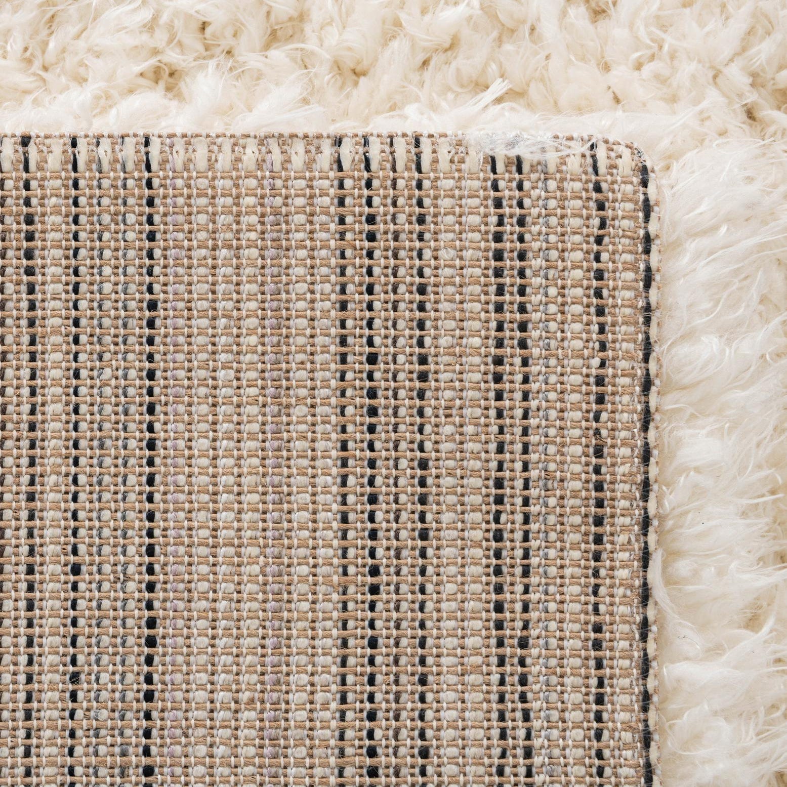 A soft, plush ivory shag runner rug, 10 ft long, ideal for adding comfort and warmth to a hallway.