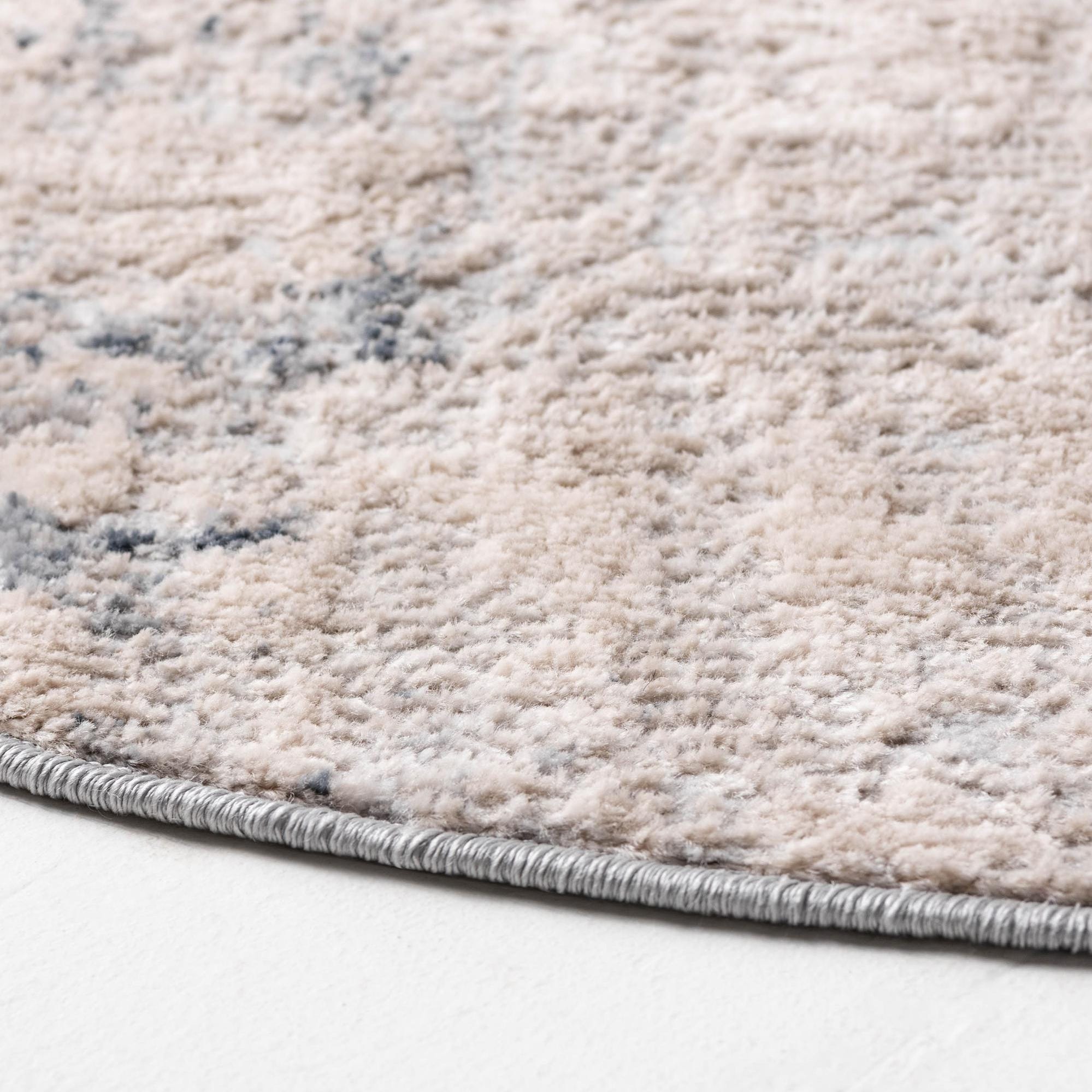 This round rug works well in transitional, coastal, modern farmhouse, or contemporary settings. Use it under a small round dining table, in a bedroom seating area, at the entry to soften a foyer, or in a home office to add warmth without heavy color. Pair with navy accents, soft gray upholstery, and natural wood tones for balanced contrast, or layer with textured throws and woven baskets for a relaxed, lived-in look.