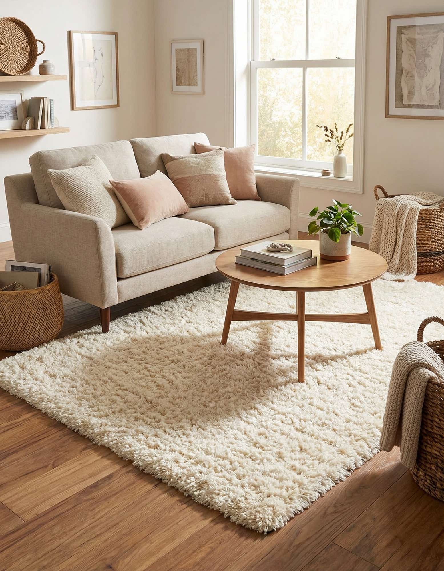This piece is especially suited to bedrooms, smaller seating areas, or a reading nook where a cozy layer is welcome, and it pairs nicely when layered over natural-fiber rugs to introduce softness. Its neutral bone and beige palette complements Scandinavian, modern farmhouse, and transitional interiors, and works well with light woods, muted upholstery, and linen accents to keep a serene, inviting atmosphere.