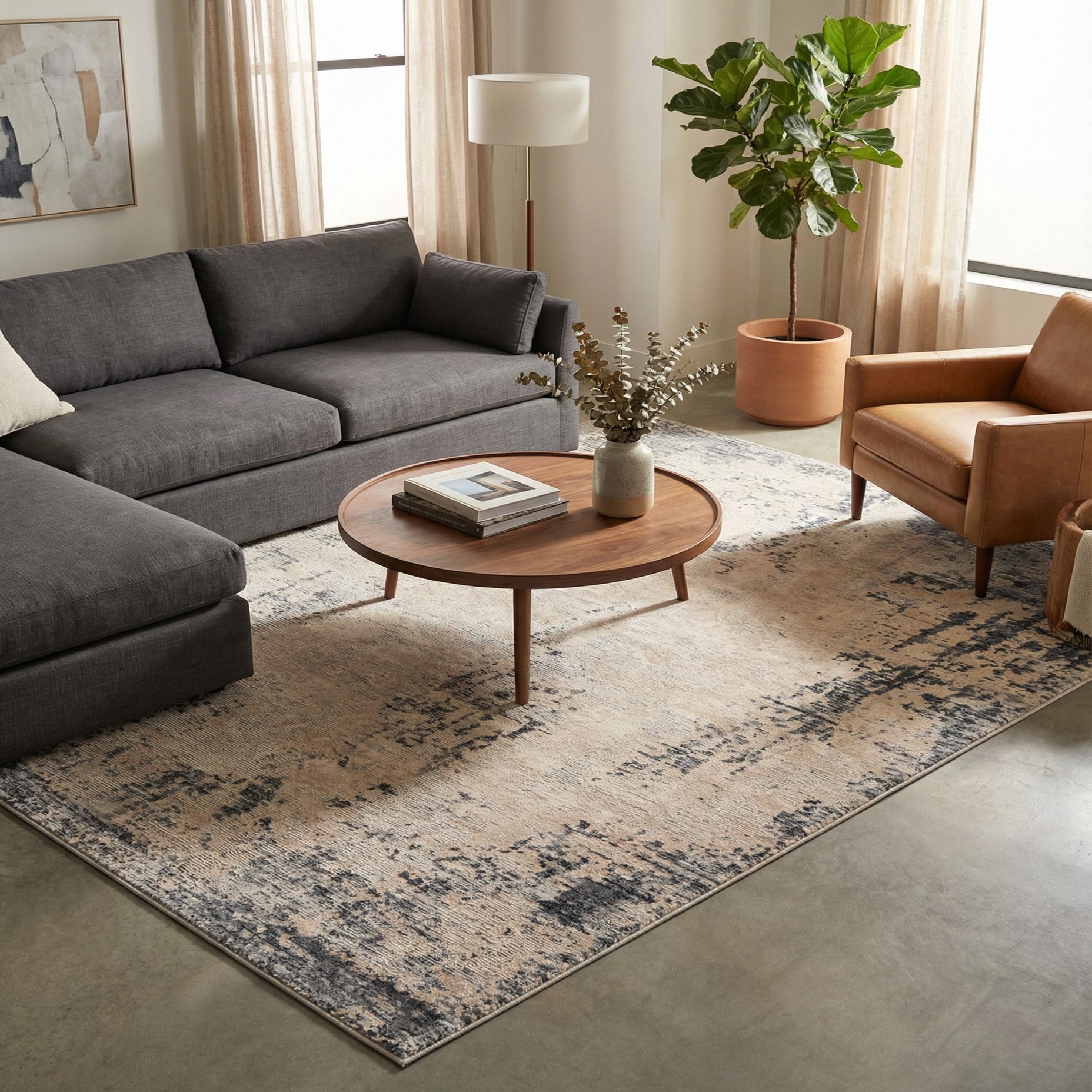 Machine-made of 60% polypropylene and 40% polyester, this rug fits easily into a variety of schemes. It pairs cleanly with neutral sofas and natural wood tones for a modern farmhouse or transitional living room, and the navy accents provide a calming anchor in coastal or contemporary interiors. Use it to ground a seating area, layer it under a bed to add softness to a bedroom, or place it in a home office where a muted, sophisticated pattern is desired.