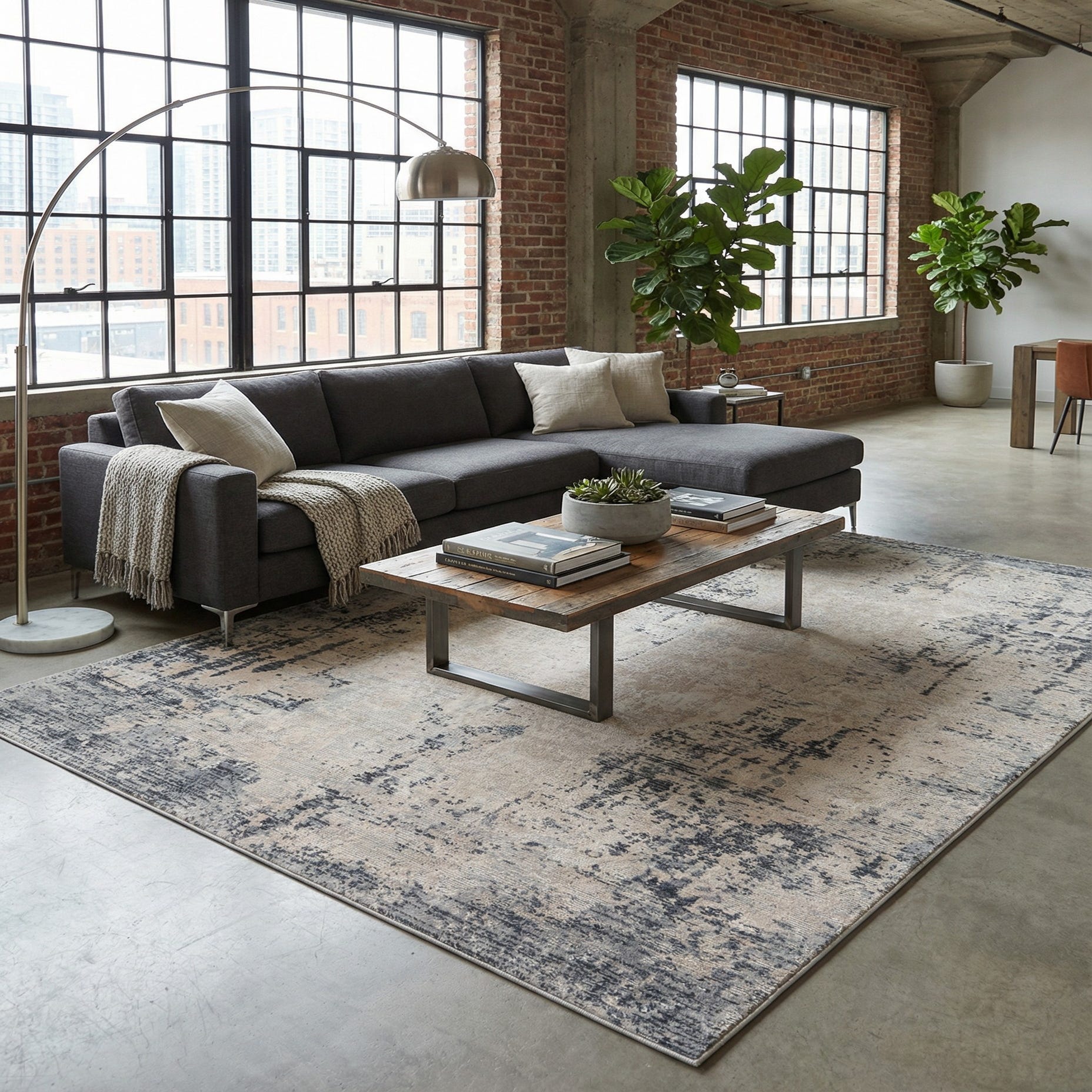 This piece works well as an anchor in a living room beneath a sofa and coffee table, under a dining table to balance warm wood tones, or at the foot of a bed to add a calm, collected layer. Pair it with clean-lined furniture, navy or charcoal accents, and natural textiles for a transitional or coastal-contemporary scheme, or use it to soften a minimalist space with a touch of lived-in character.