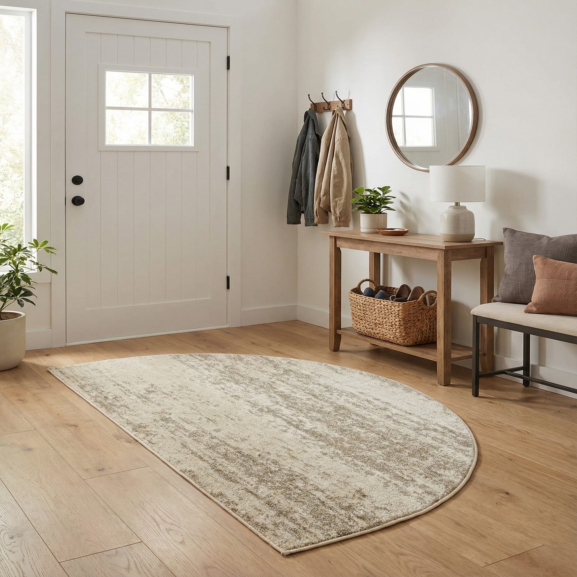 A 2' 7 x 4' 0 hearth-shaped rug in bone beige with a subtle, textured pattern, perfect for an indoor space.