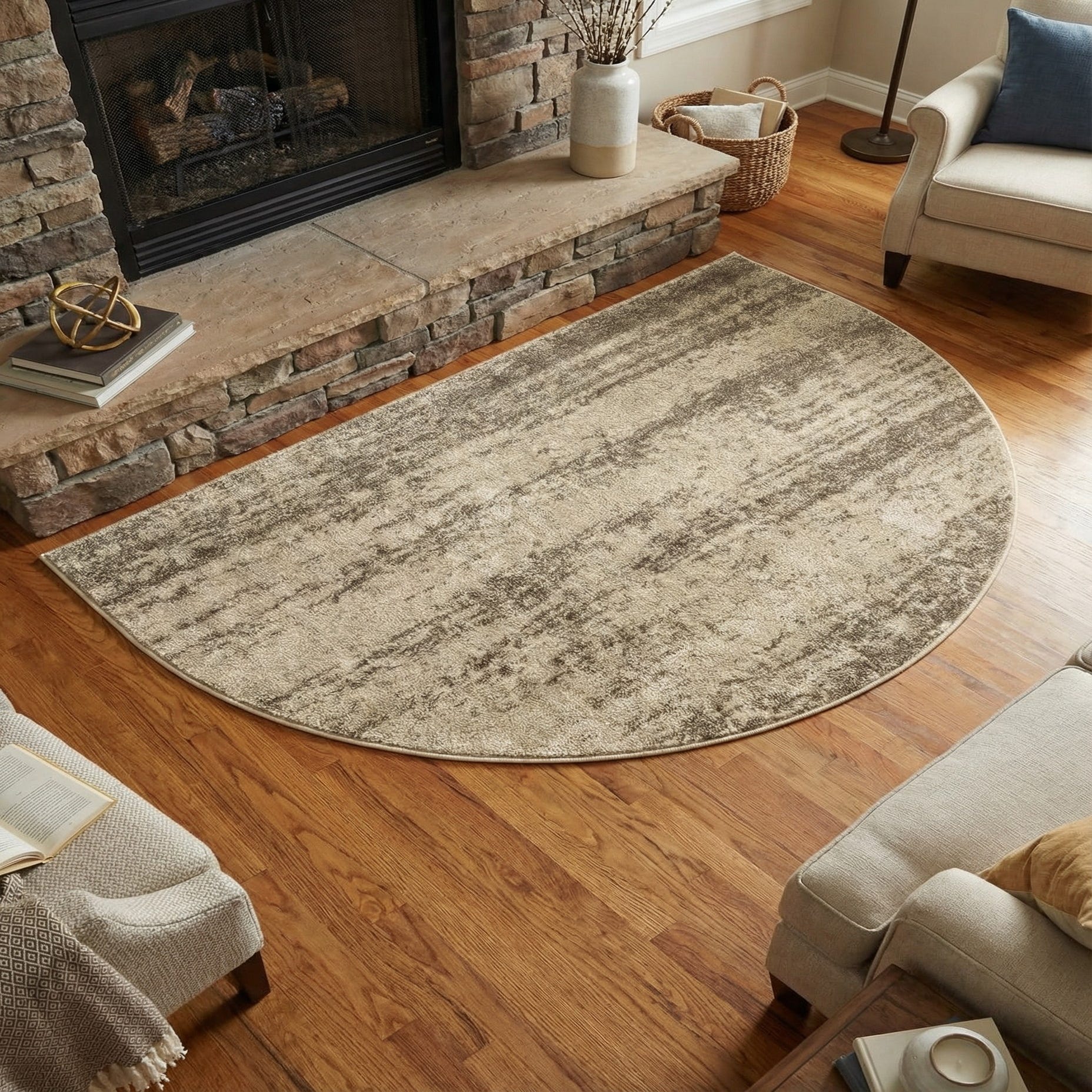 Use it as a hearth accent to warm a fireplace setting, or layer it in an entryway or narrow hall to introduce subtle texture. It pairs well with warm wood tones, linen and leather upholstery, and matte metal accents for a relaxed, contemporary feel, or with clean-lined, monochrome furnishings to add softness and tone-on-tone interest without competing patterns.