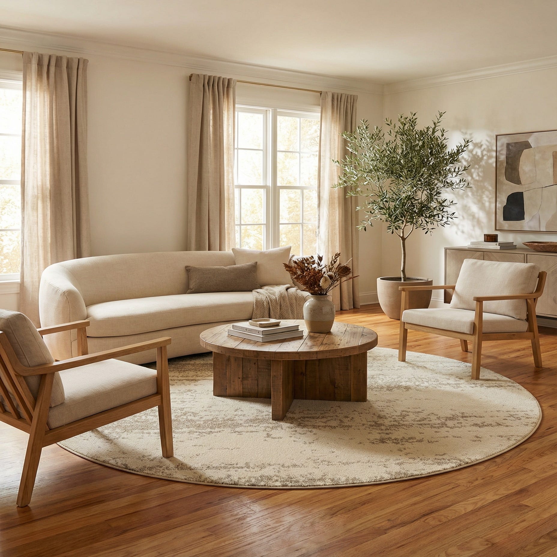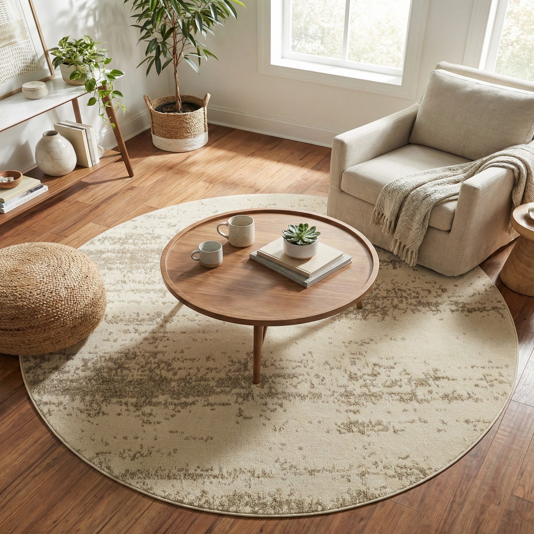 The neutral palette and subtle pattern give this rug the flexibility to integrate into numerous decor styles. It could serve as an understated foundation in a contemporary living room, add warmth to a minimalist bedroom, or balance the aesthetics of a transitional dining area. The round shape also makes it an excellent choice for creating an inviting nook or as an anchor for furniture groupings in an open-space setting.