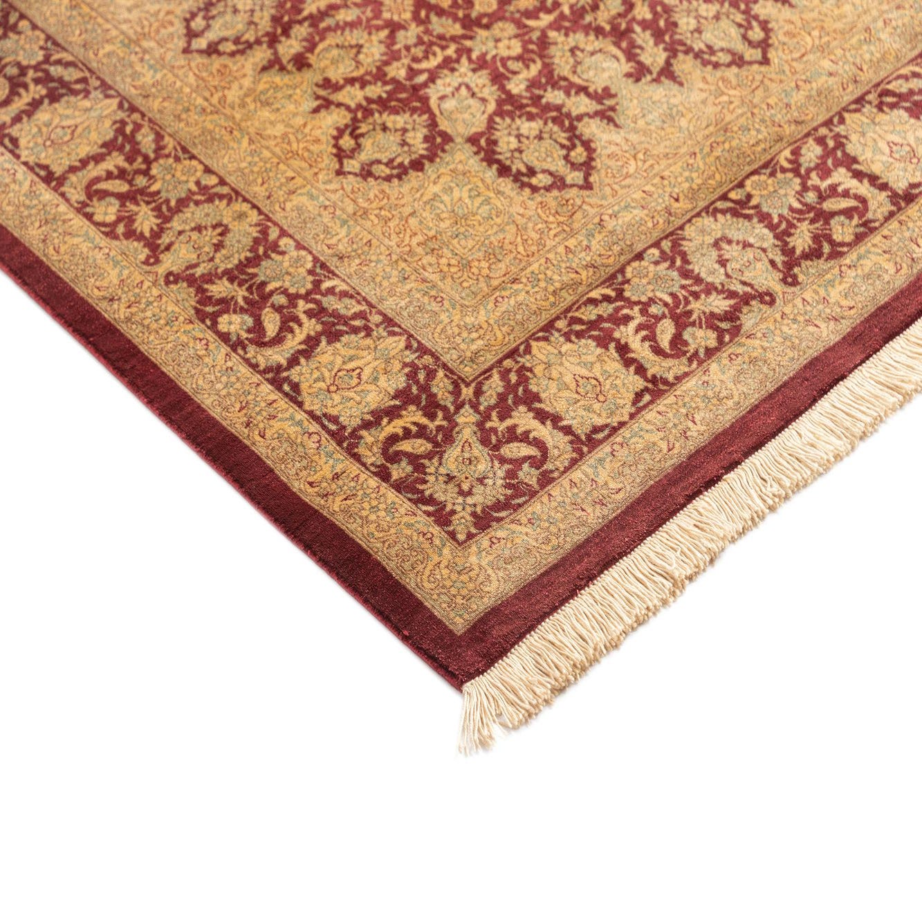 Handmade of silk, this rug presents a classic Persian medallion layout set against a rich bordeaux field. A cream and beige central medallion blooms outward into finely detailed floral arabesques, while burgundy outlines and touches of yellow and green accent the scrolling vines and palmettes. The silk pile is smooth and low, with a soft, cool hand and a subtle, luminous sheen that highlights the precise knotting and delicate pattern work.