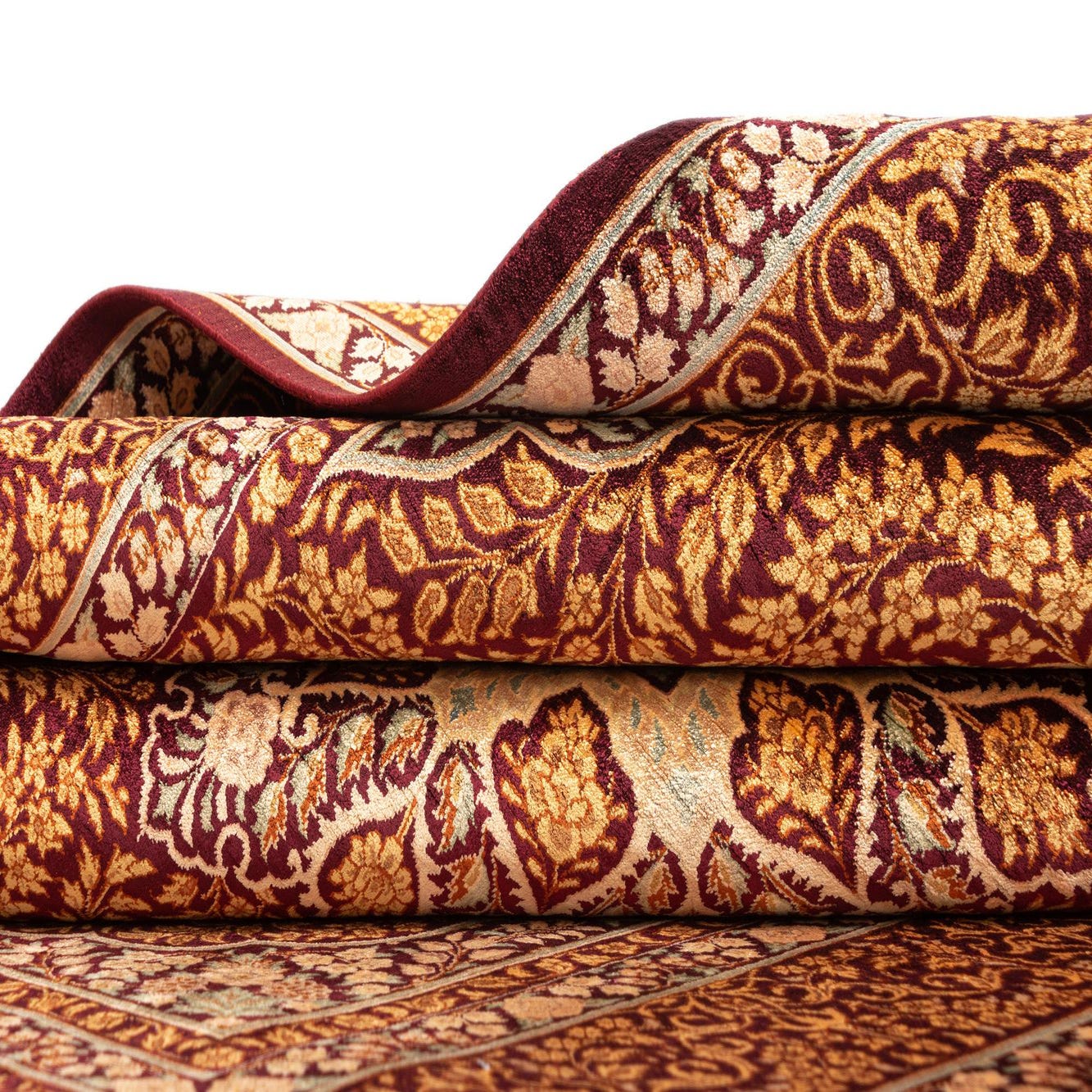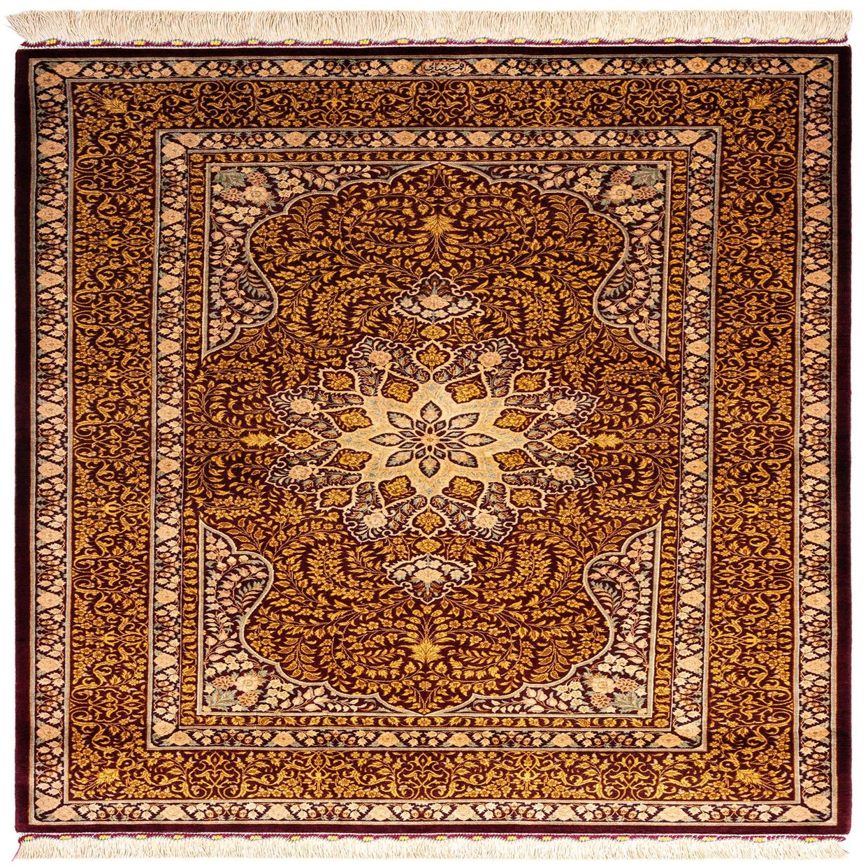 A rectangular 3x5 Bordeaux Persian silk rug with intricate gold floral patterns and a central medallion.