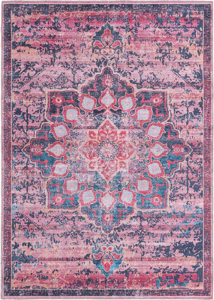 Primary color is Brick. Colors in this rug include: Brick, Black, Blue, Ivory, Rust Red, Orange.