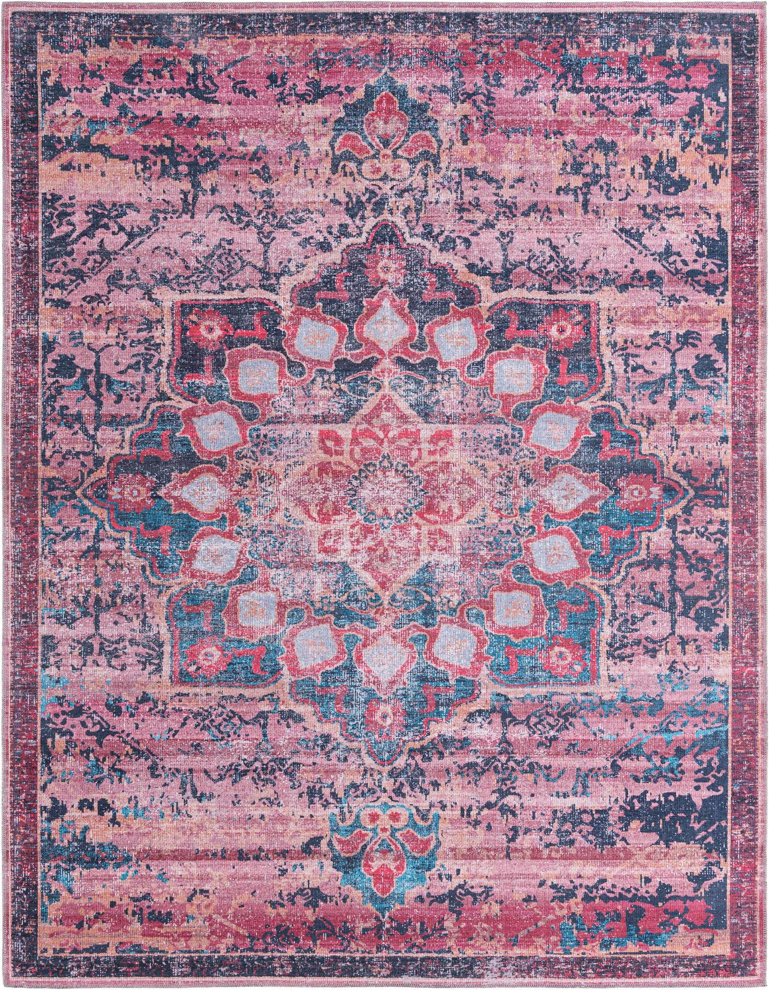 Primary color is Brick. Colors in this rug include: Brick, Black, Blue, Ivory, Rust Red, Orange.