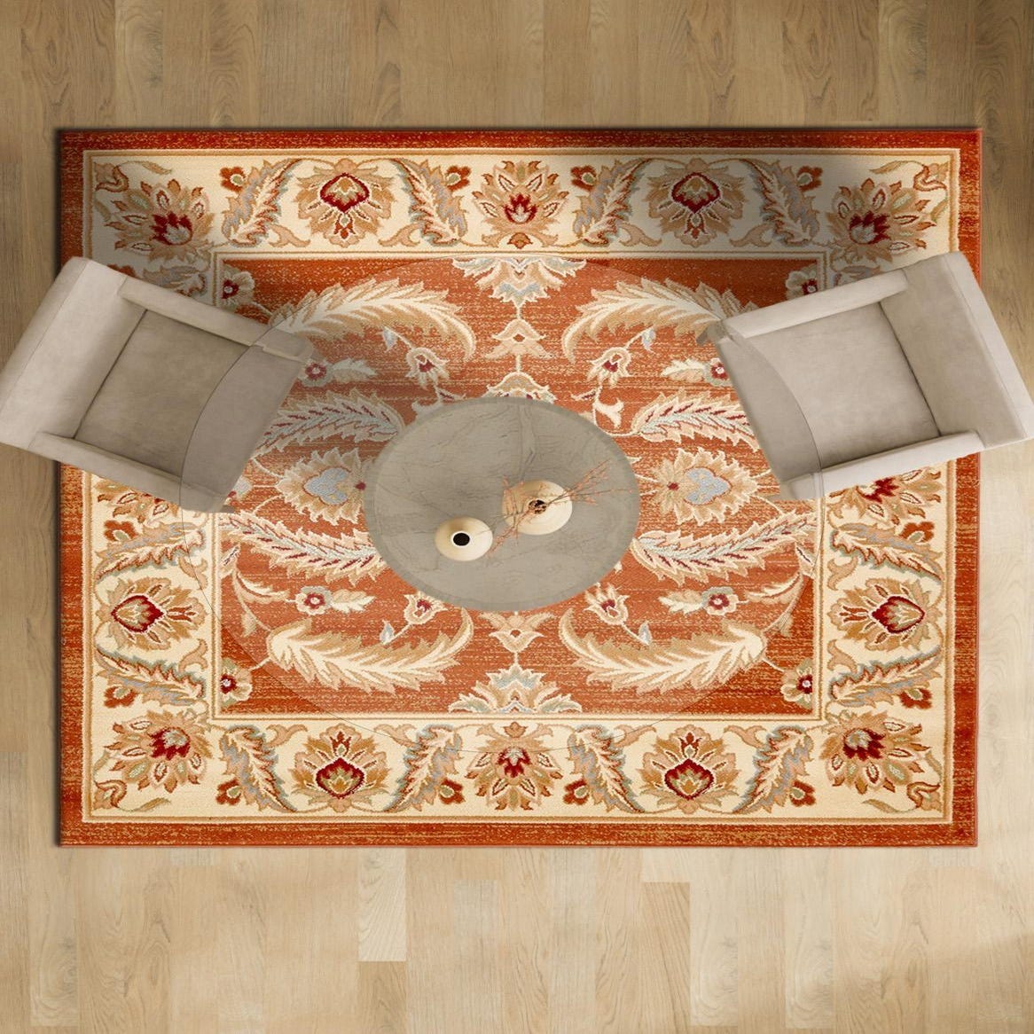Well suited to traditional and transitional interiors, this rug can anchor a seating area to add warmth and color or sit beneath a dining table where the cream border frames the setting. It also complements wood furniture, leather pieces and muted blue or green accents, making it a good choice for living rooms, formal dining rooms, studies or entryways that benefit from layered, classic patterning.