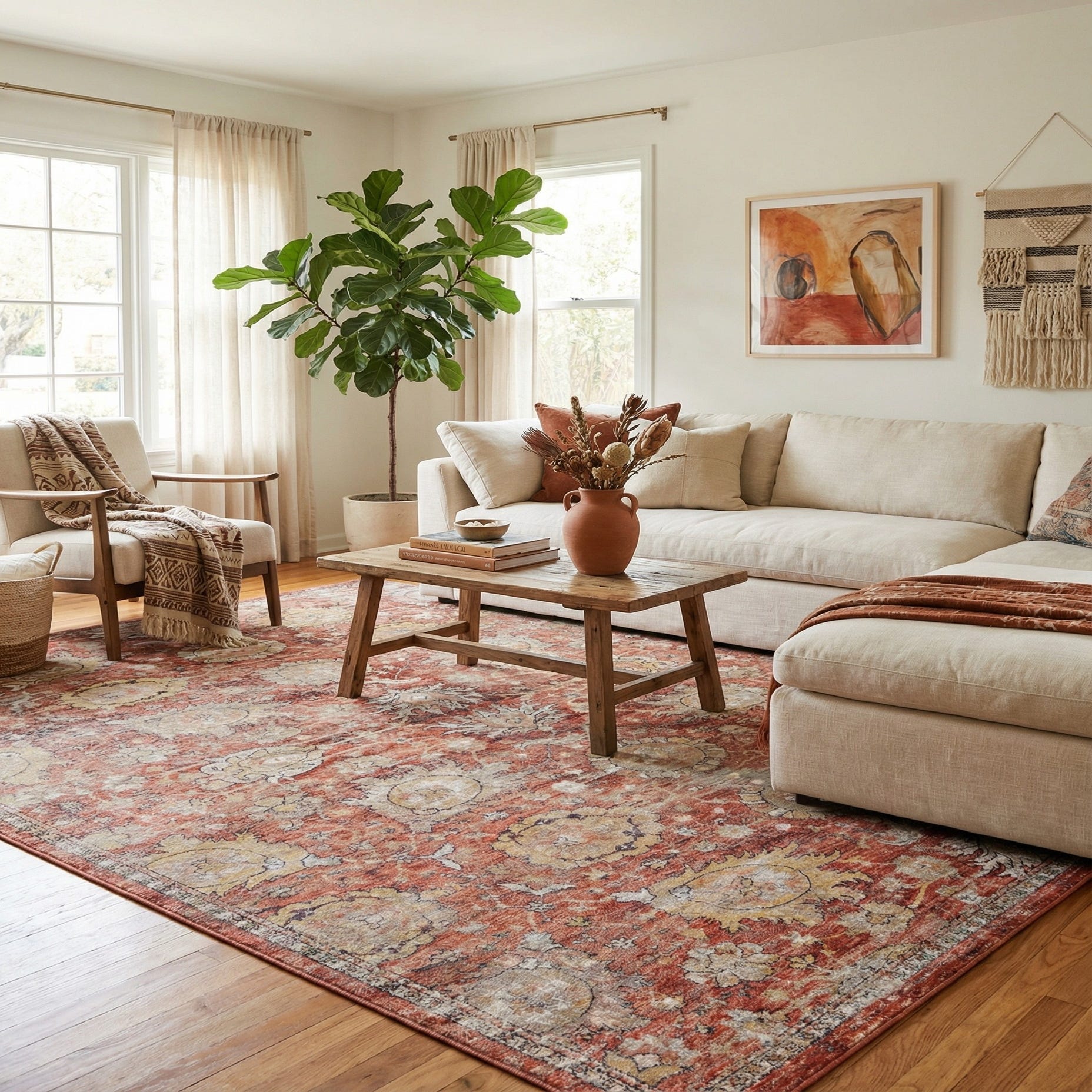Machine-made from polypropylene, the rug has a low, dense pile that feels smooth and slightly cushioned underfoot, with a consistent surface and neatly finished edges. It pairs naturally with warm wood floors, leather seating and brass or aged-metal accents in a traditional or transitional living room, and it also anchors a dining area or master suite when layered with neutral upholstery and textured textiles. Use it to introduce color and pattern to farmhouse, bohemian, or classic interiors without overwhelming the room.