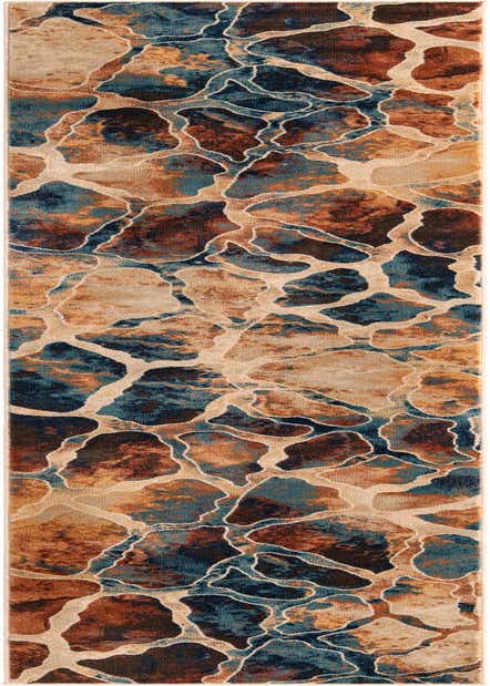 This piece is distinguished by its dynamic pattern, reminiscent of organic shapes found in natural stone formations. The interactive play of colors includes brick red as the striking background hue, complemented by touches of beige, blue, brown, and cream, weaving a tapestry of warm and cool tones together. The intriguing design offers a sense of movement and depth, which can act as a focal point in a variety of settings.