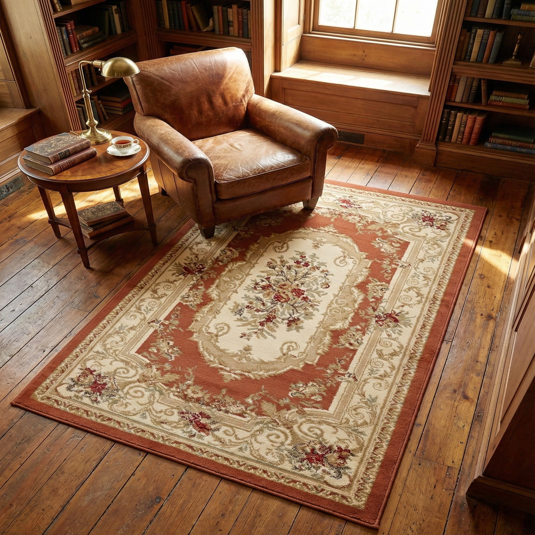 A traditional floral medallion rug with a warm brick red field that frames a cream central cartouche and a cascade of finely detailed floral sprays. Scrollwork and carved-style motifs in tan and brown create layered borders, while accents of red, rust and green bring depth to the bouquet and corner ornaments. The overall effect is a classic, old-world look rendered in a clear, symmetrical layout that reads as formal without feeling fussy.
