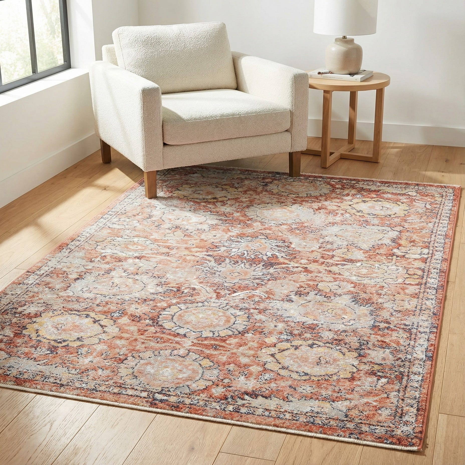 Machine-made polypropylene construction yields a low-profile pile with a consistent, slightly cushioned hand and a faint, soft sheen. The surface feels smooth underfoot and the pattern reads clearly without heavy texture, making it easy to layer beneath a coffee table or place in a high-traffic entryway. Pair it with warm wood furniture and neutral upholstery to let the brick red anchor the room, or use navy and ivory textiles to pull out the pattern’s accents; it also complements eclectic or transitional interiors where a hint of vintage character is welcome.
