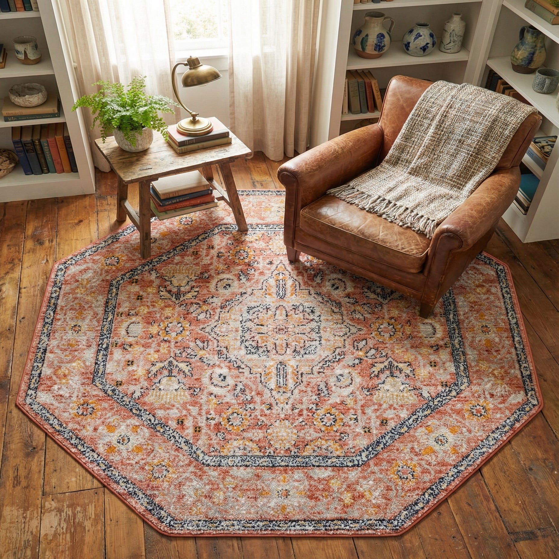 Machine-made from polypropylene, the rug has a low, even pile with a smooth hand that sits comfortably underfoot and layers well with seating or table arrangements. Its octagonal shape makes it an easy choice for a foyer or entry, a cozy reading nook, or centered beneath a small round dining table. Pair it with warm wood furniture, neutral upholstery, and navy or brass accents for a balanced, inviting room; it also works well with eclectic or cottage-style decor when layered with textured throws and mixed-pattern pillows.