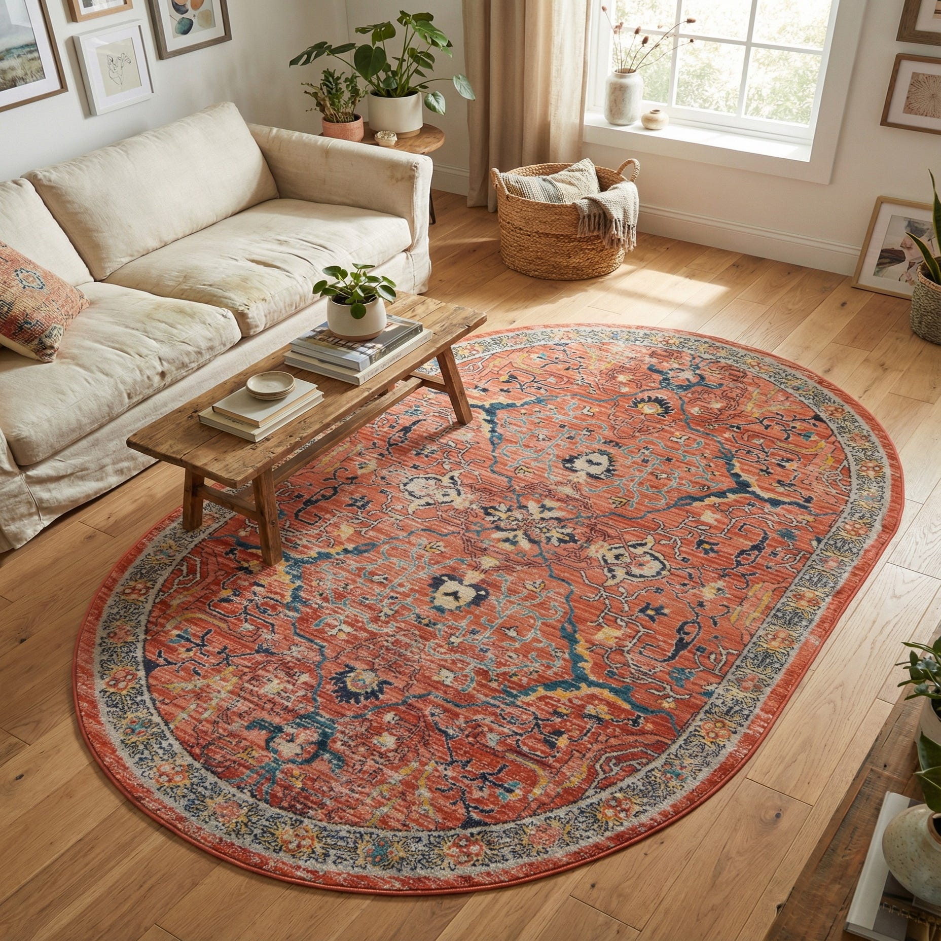 This oval rug works well as an anchor for a foyer, a small seating area, or layered beneath a round dining table. Pair it with warm wood furniture, navy or denim upholstery, and brass or aged-metal accents for a cohesive scheme, or use it to introduce color and pattern into a neutral, transitional, or eclectic room. Its combination of traditional motifs and lively hues makes it an easy fit where classic and contemporary elements meet.