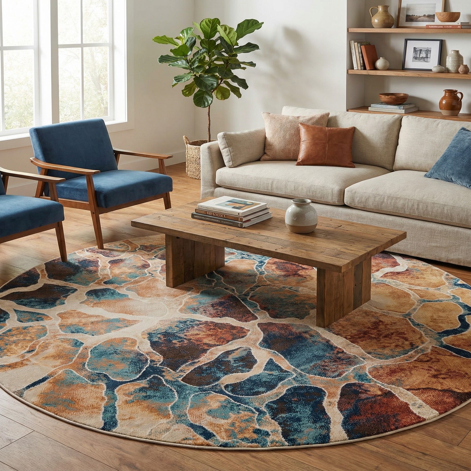Machine-made from 100% polypropylene, the rug has a low-to-medium pile that feels smooth with a touch of plushness underfoot and a refined visual sheen. It pairs well with warm wood furniture and leather accents for a cozy living area, anchors a round dining table with lively color contrast, or adds personality to an entry or study when layered over neutral flooring. Combine it with cream upholstery and navy or rust accessories to pull the blue and brick red tones through the space for a cohesive, lived-in look.