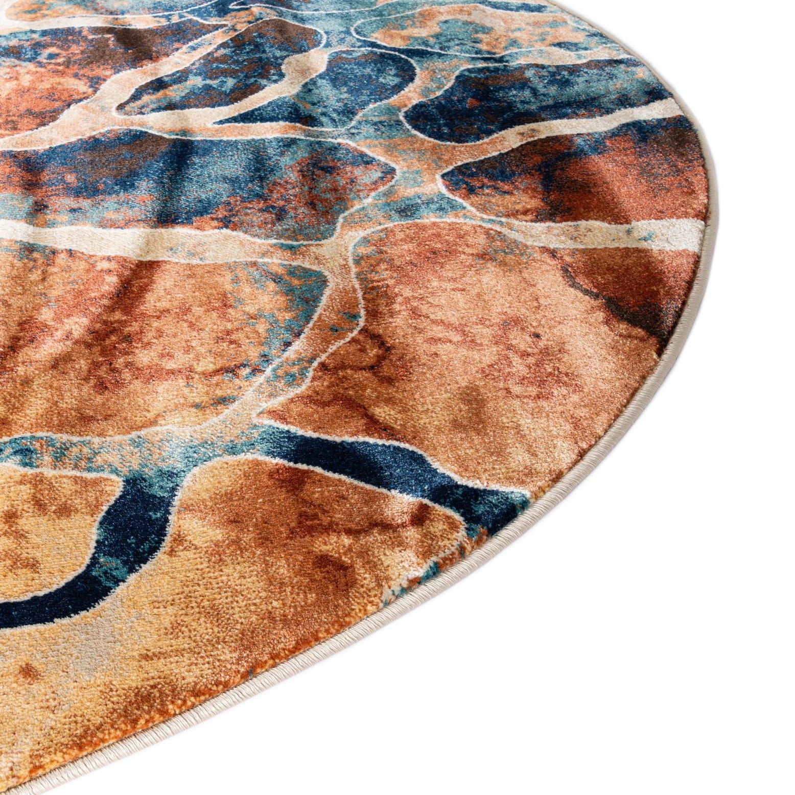 Machine-made from 100% polypropylene, the rug has a low-to-medium pile that feels smooth with a touch of plushness underfoot and a refined visual sheen. It pairs well with warm wood furniture and leather accents for a cozy living area, anchors a round dining table with lively color contrast, or adds personality to an entry or study when layered over neutral flooring. Combine it with cream upholstery and navy or rust accessories to pull the blue and brick red tones through the space for a cohesive, lived-in look.