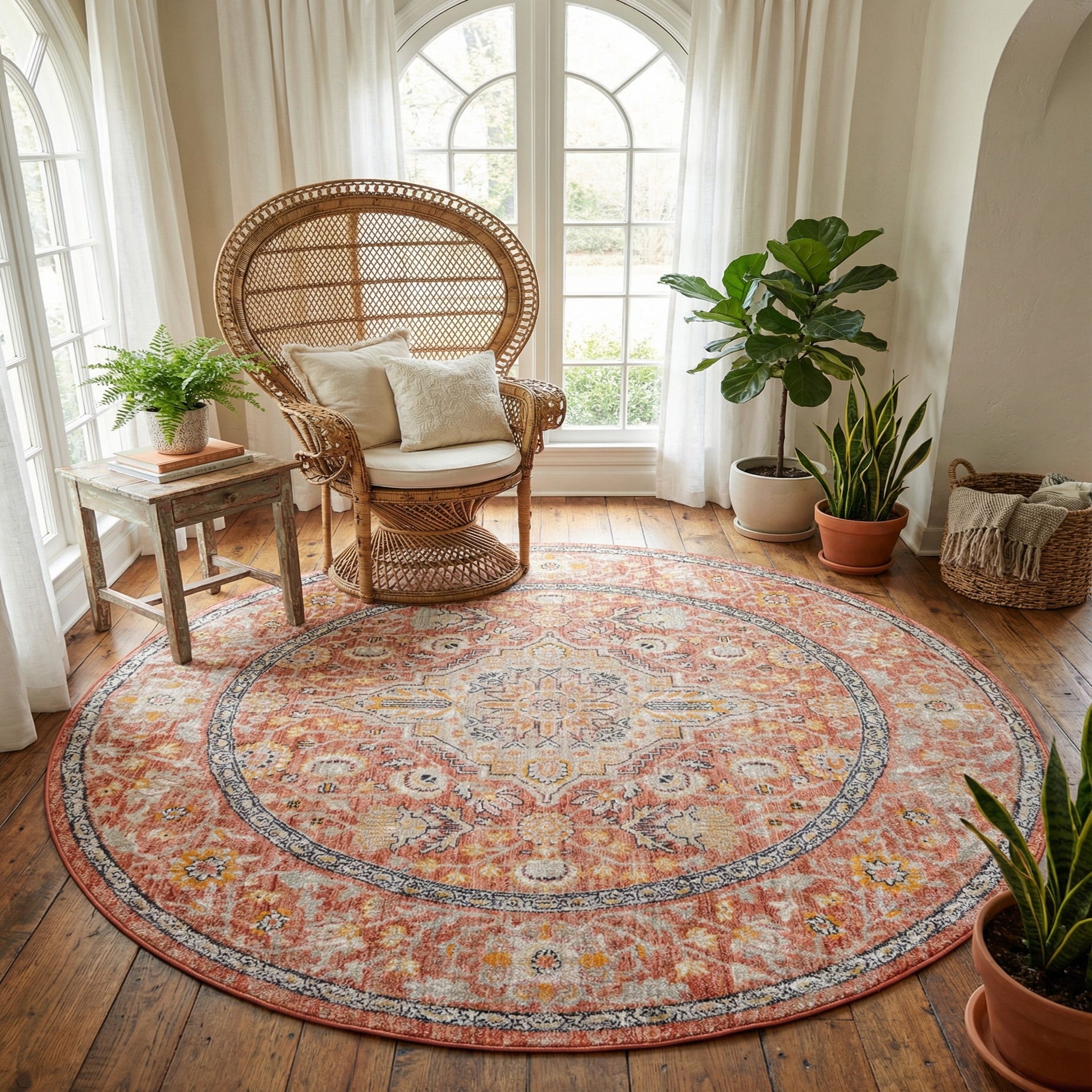 This round piece works well beneath a dining table or as a focal point in a seating area, entryway, or sunlit breakfast nook. It pairs naturally with warm wood tones, ivory linens, and navy accent pillows, and complements styles ranging from transitional and cottage to relaxed traditional or bohemian interiors. Combine it with brass or matte-black fixtures and natural textures like rattan or jute for layered, lived-in styling that highlights the rug’s color palette and pattern.
