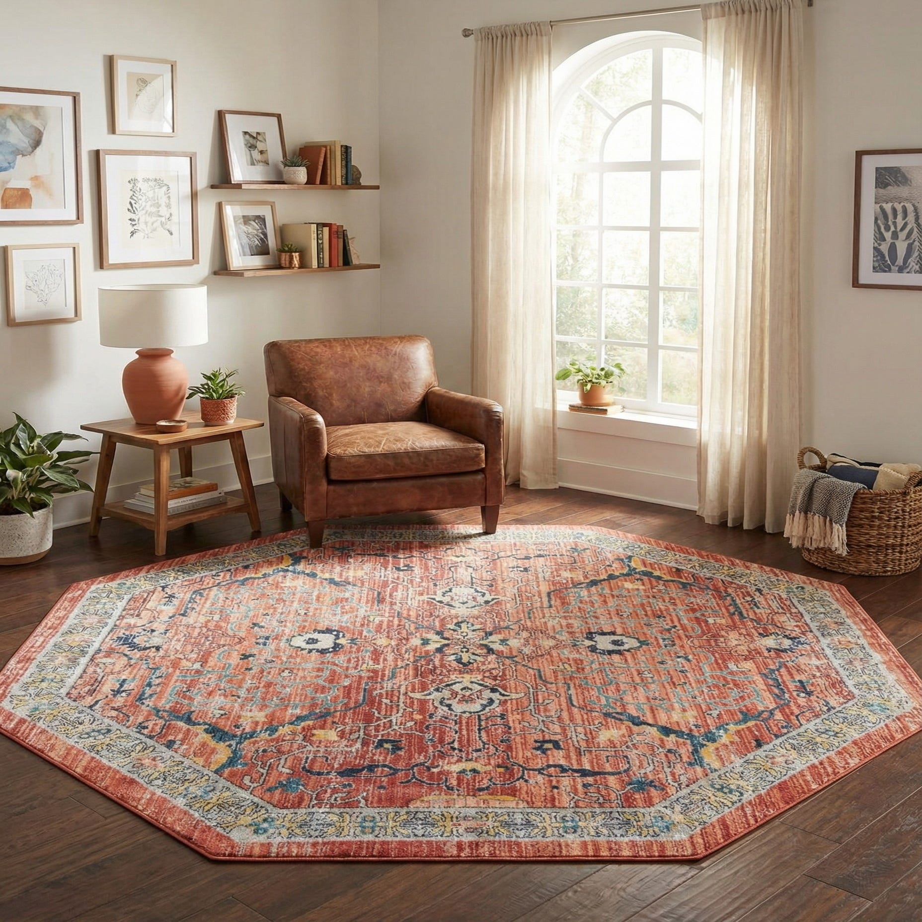 Works well beneath a round dining table or in an entry hall where the octagonal shape creates a distinct focal point. Pair it with warm wood furniture and neutral upholstery to let the brick red carry the palette, or layer it into a bohemian or global-inspired scheme with mixed textiles and blue accent pieces to pick up the cooler tones. It also suits a cozy reading nook or home office, where the patterned surface adds personality without overwhelming the room.
